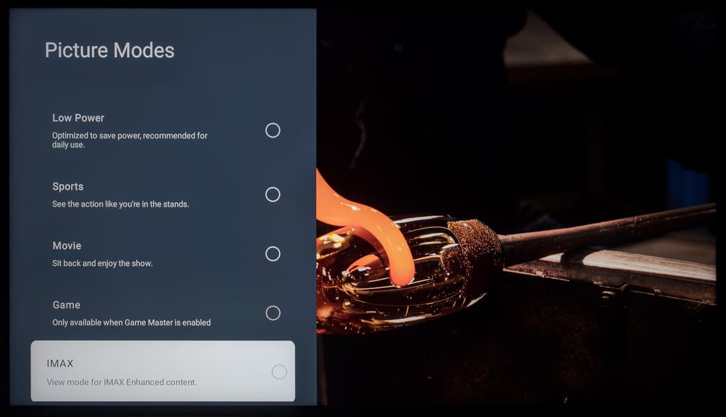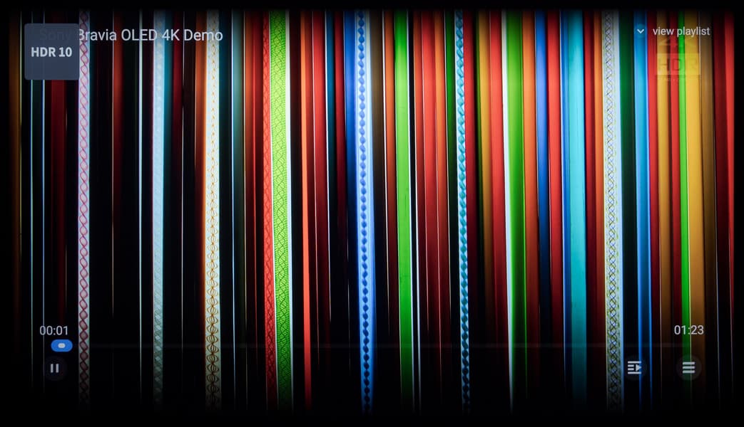 Воспроизведение тестовых видеороликов с 10-битным цветом и плавными градиентами показало, что заметность переходов между оттенками гораздо ниже, чем при простом 8-битном выводе без HDR. Цвета контента HDR более насыщенные, чем в случае отключения HDR, работа локальной подсветки устанавливается на максимум. Система быстро и эффективно регулирует контраст сцены и яркость подсветки каждой зоны, усиливает локальный и микроконтрасты. Появляется режим IMax, который больше похож на различные Filmmaker в моделях других известных брендов — картинка теплая, с адекватной резкостью и хорошей различимостью в тенях и светах, без лишней насыщенности.