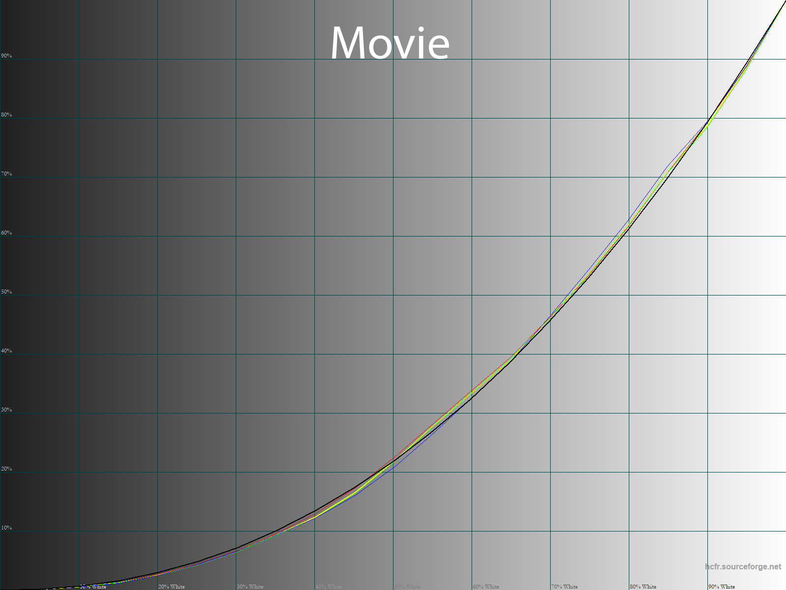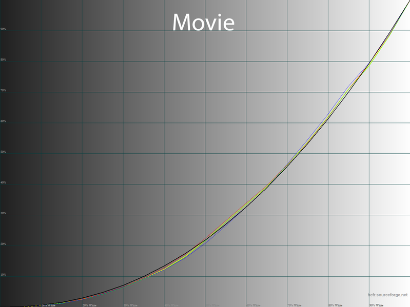 Гамма-кривые также установлены на уровне выше среднего — гамма 2,14 для двух режимов PC и 2,24 для Movie. В последнем есть более выраженный завал в тенях, а вот дисбаланс между RGB-каналами отсутствует у всех проверенных пресетов.