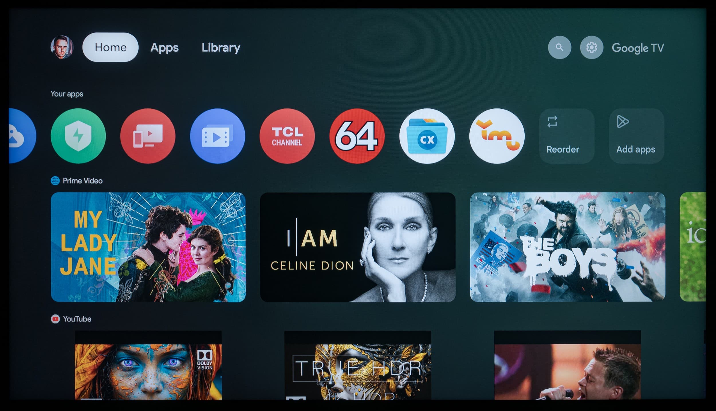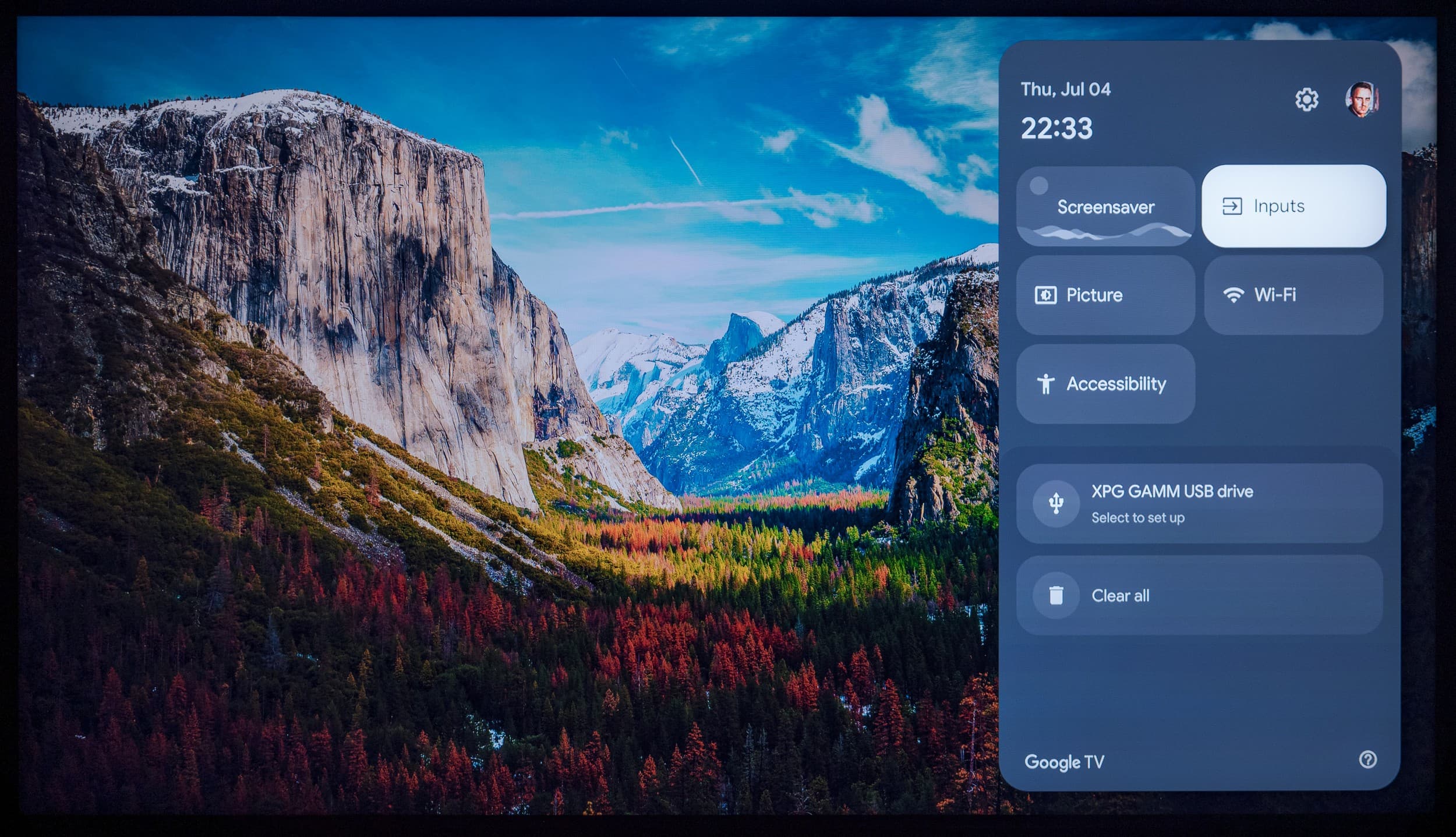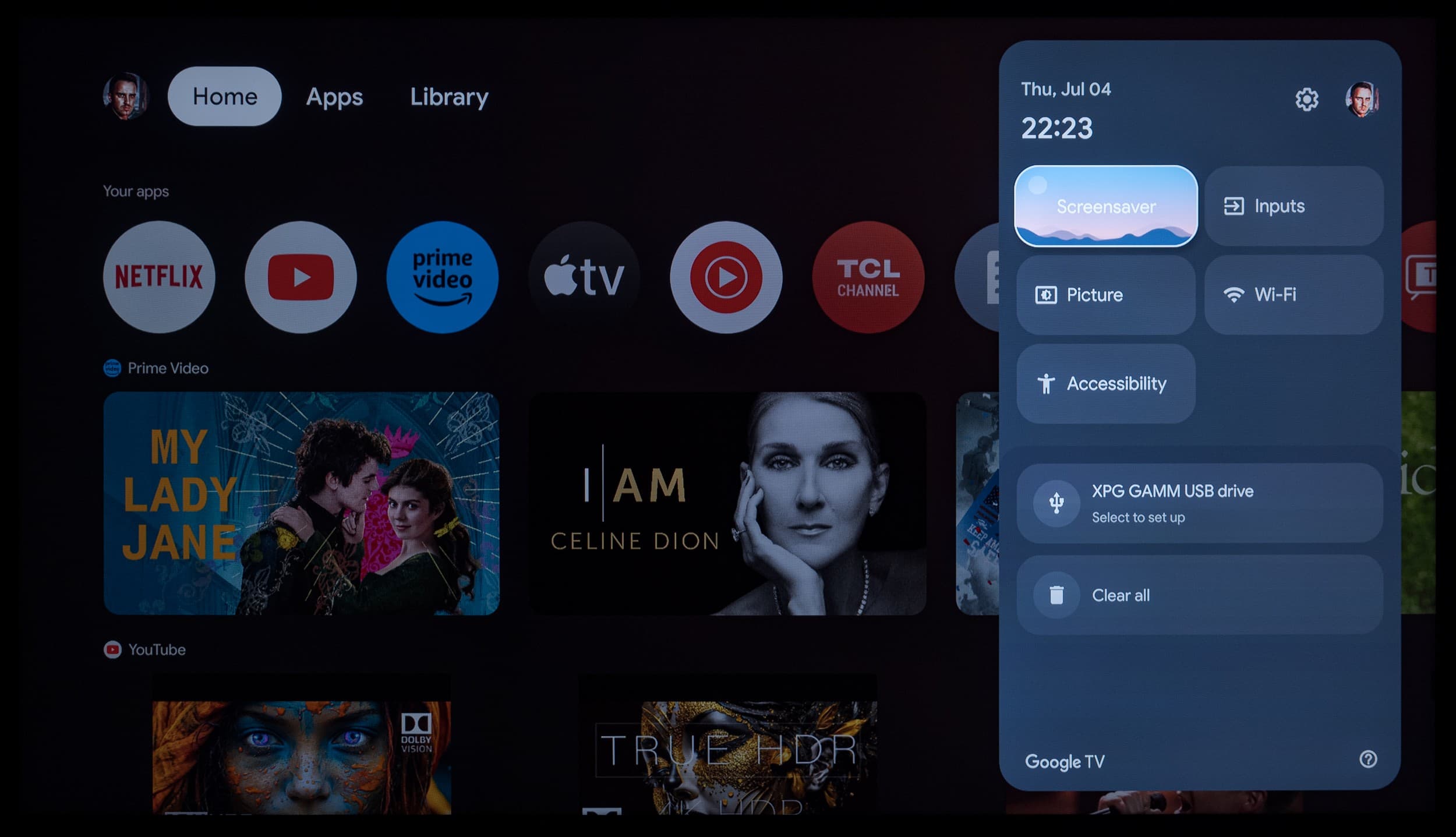 Основной блок настроек изображения и звука, доступный при работе с любым подключением и при выводе любого контента, представлен в хорошо знакомом виде — как у всех телевизоров с Google TV, в виде бокового меню (слева). Есть отдельный (классический) блок Google с быстрым доступом к основным разделам и функциям, а также панель самой TCL с настраиваемыми функциями быстрого доступа, которая вызывается отдельной клавишей на пульте ДУ.