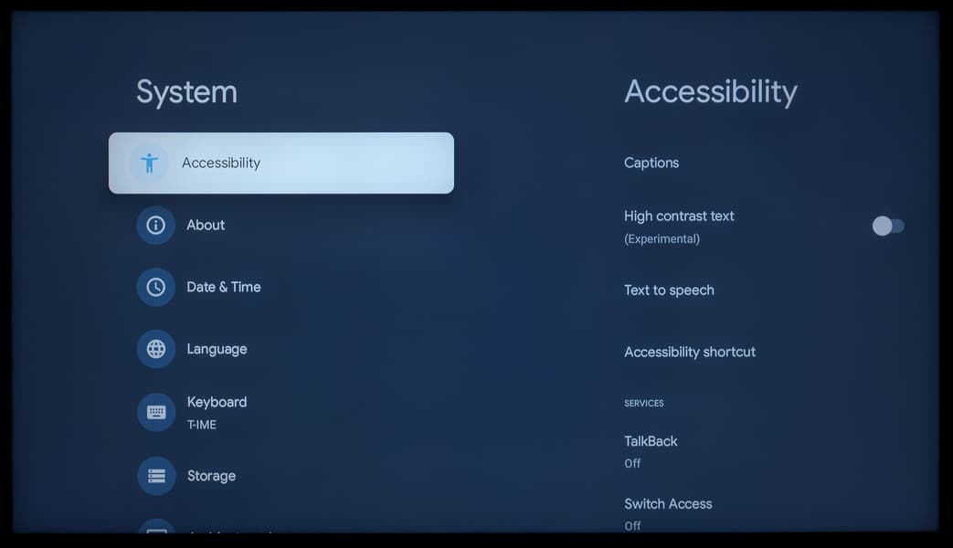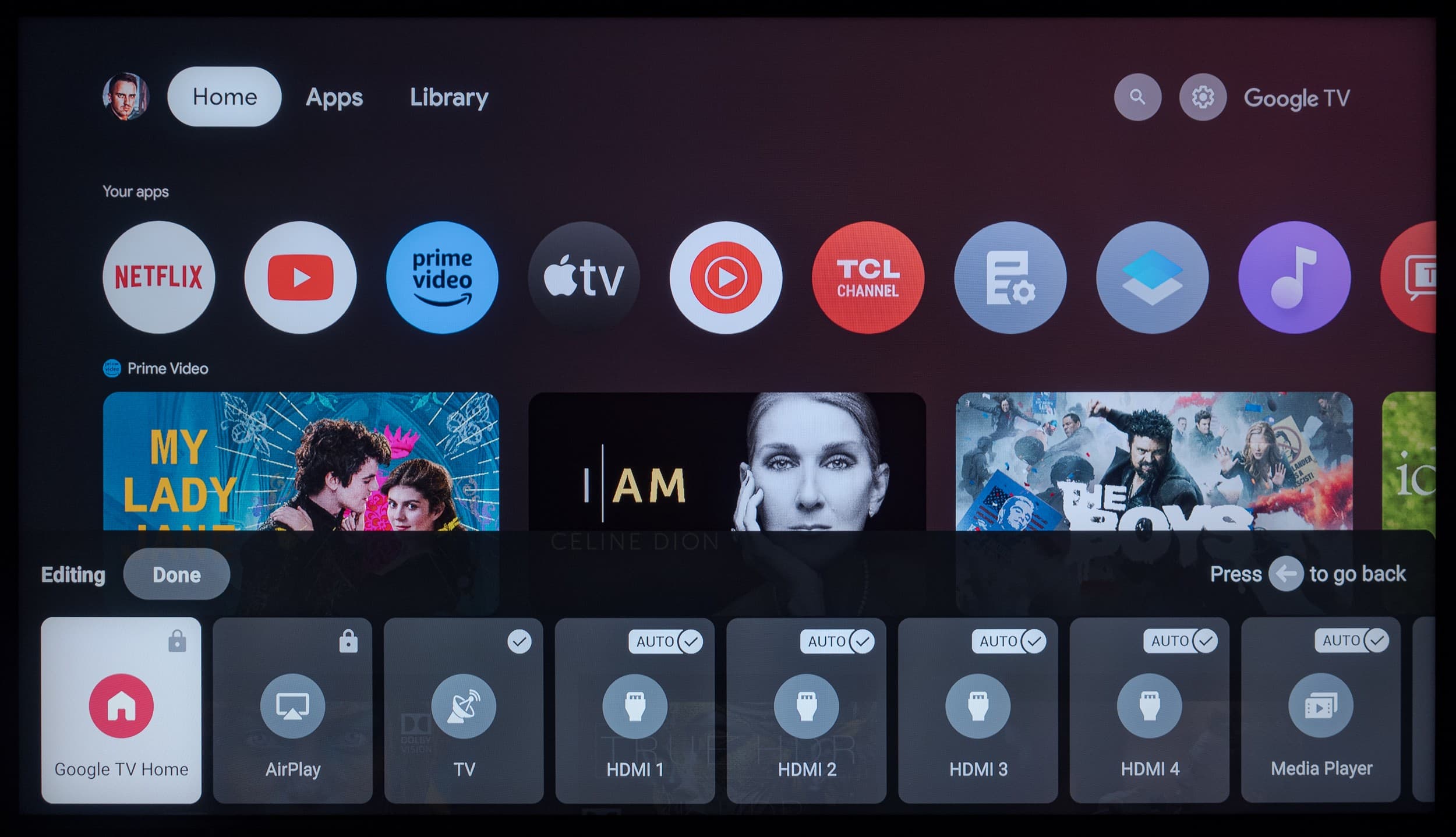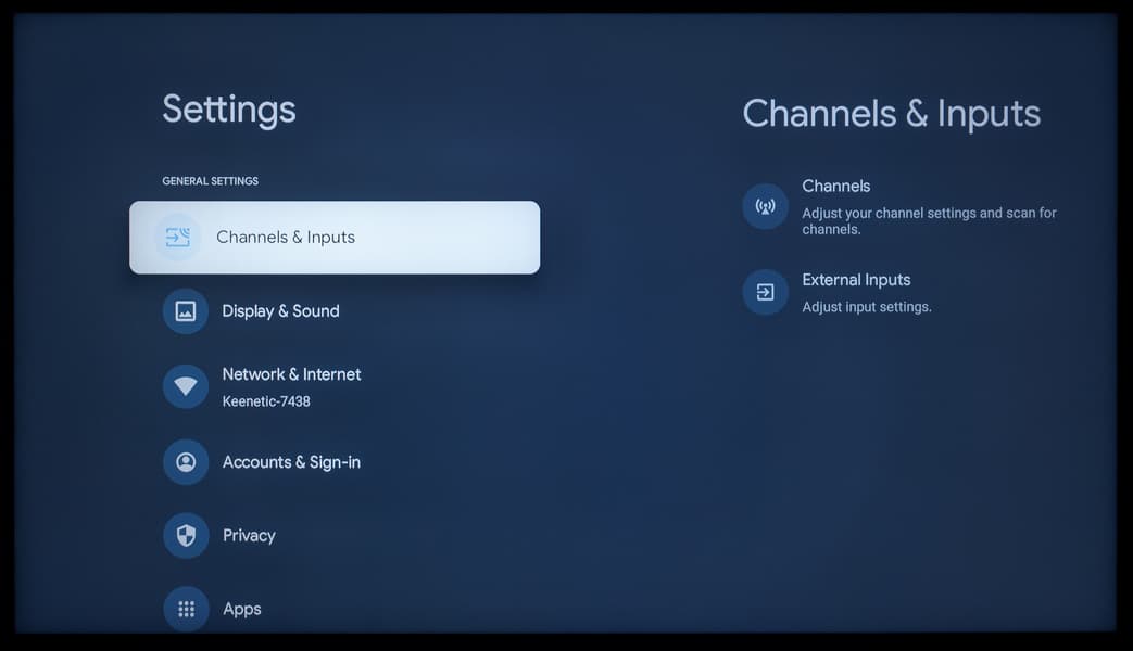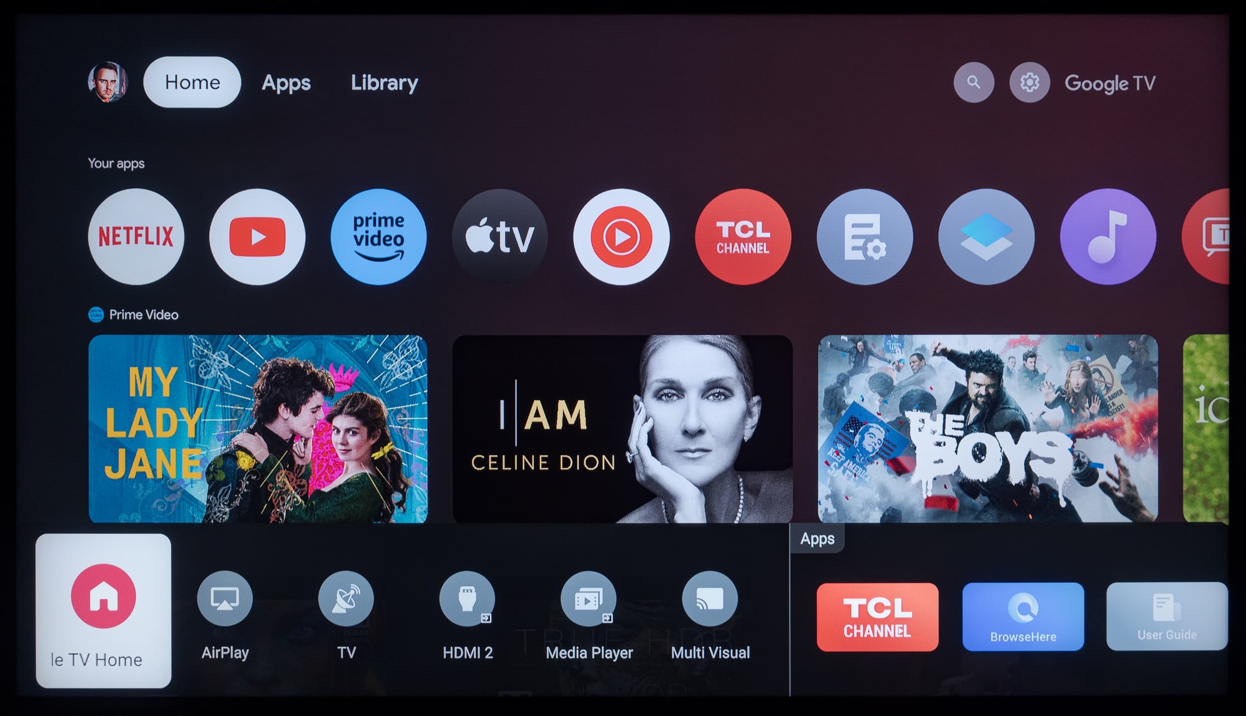 Основной блок настроек изображения и звука, доступный при работе с любым подключением и при выводе любого контента, представлен в хорошо знакомом виде — как у всех телевизоров с Google TV, в виде бокового меню (слева). Есть отдельный (классический) блок Google с быстрым доступом к основным разделам и функциям, а также панель самой TCL с настраиваемыми функциями быстрого доступа, которая вызывается отдельной клавишей на пульте ДУ.