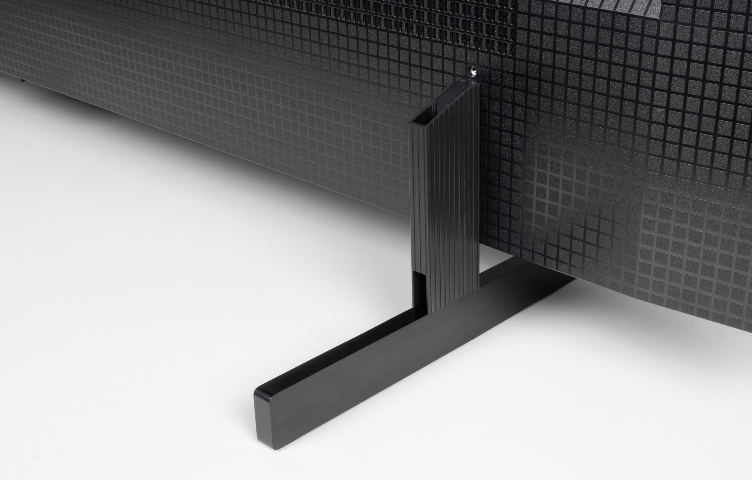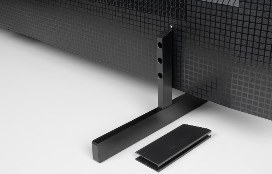 Штатная подставка модели TCL 85C855 состоит из двух отлитых из алюминия и покрашенных темно-серой краской Т-образных ножек. Они крепятся к задней части корпуса винтами из комплекта поставки, а места креплений закрываются декоративными пластиковыми накладками.