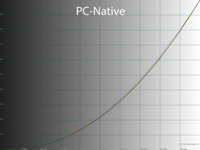 Ниже приведен спектр для белого поля (белая линия), наложенный на спектры красного, зеленого и синего полей (линии соответствующих цветов) для режима экрана «PC — Native» с полной цветовой гаммой: