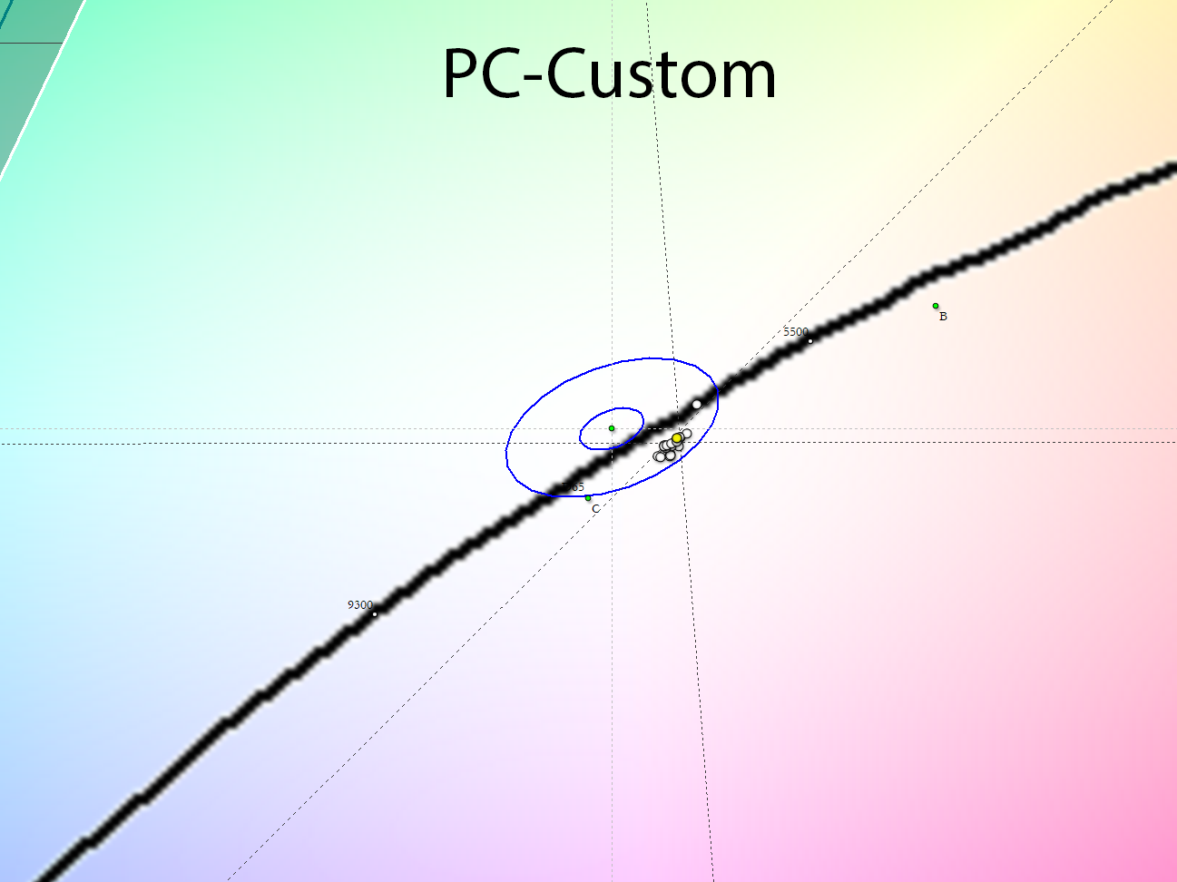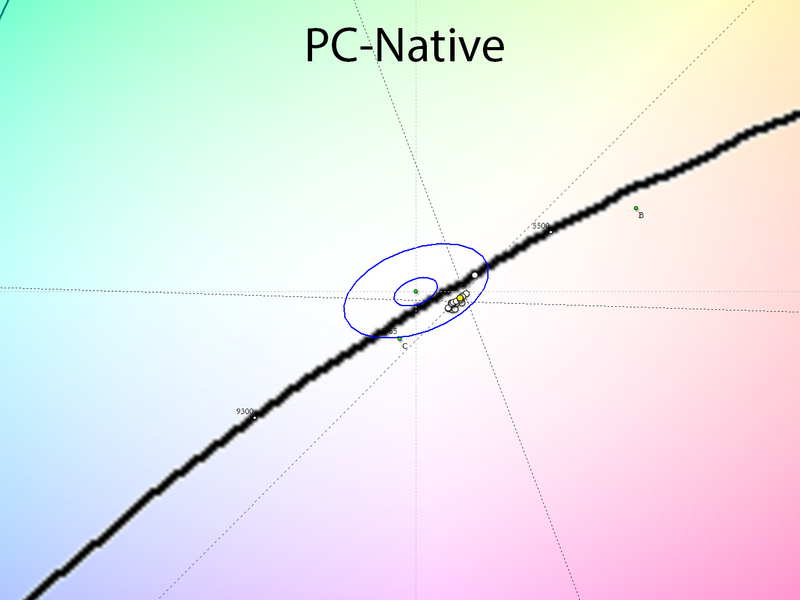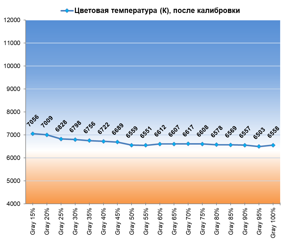 После настройки и калибровки точка белого пришла в абсолютную норму, однако стабильность ЦТ оттенков серого снизилась. В этом случае калибровка ухудшила результаты, что дает повод задуматься о том, так ли она была нужна. Может быть, достаточно откорректировать значения яркости и RGB точки белого и более ничего не делать.
