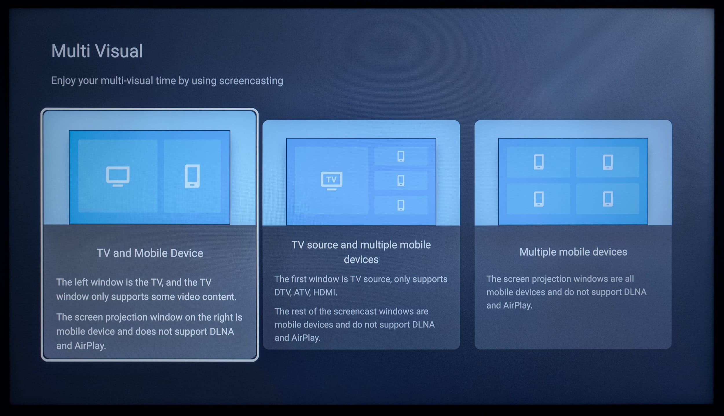 Кроме того телевизор поддерживает работу по стандарту Apple AirPlay 2 при использовании соответствующей техники «яблочного» бренда — такое соединение гораздо стабильней и комфортней, чем в случае использования Android-устройств. Также доступны варианты использования экрана ТВ с одним мобильным устройством и 3-4, как с выводом дополнительного изображения из среды Google TV, так и без него.