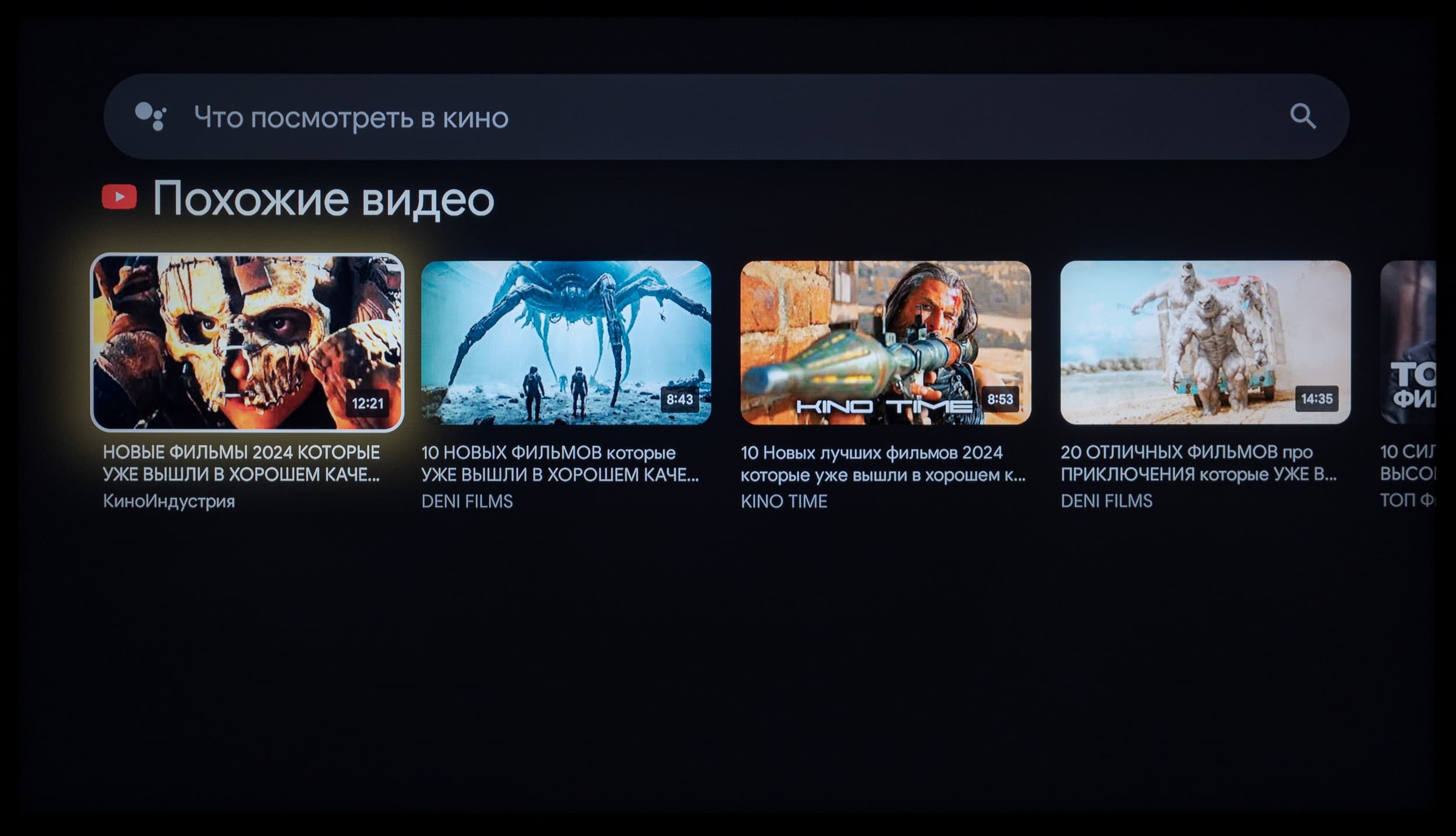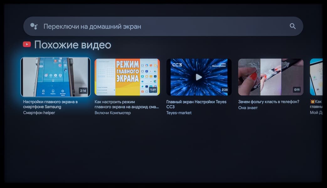 По словам и фразам, не распознанным как команды, выполняется поиск, и в результатах поиска будет предложен развлекательный контент, в том числе из YouTube, а иногда открывается страница приложения в магазине Google Play с названием, соответствующим поисковой фразе. Неверно сформулированные даже самые простые команды типа «переключи на домашний экран» (пример ниже) могут быть распознаны в качестве поискового запроса для YouTube или веб-браузера. Так что советуем ознакомиться со списком команд, на который ТВ отреагирует правильным образом.