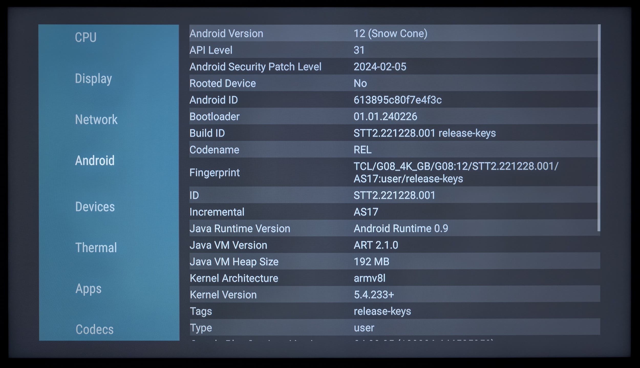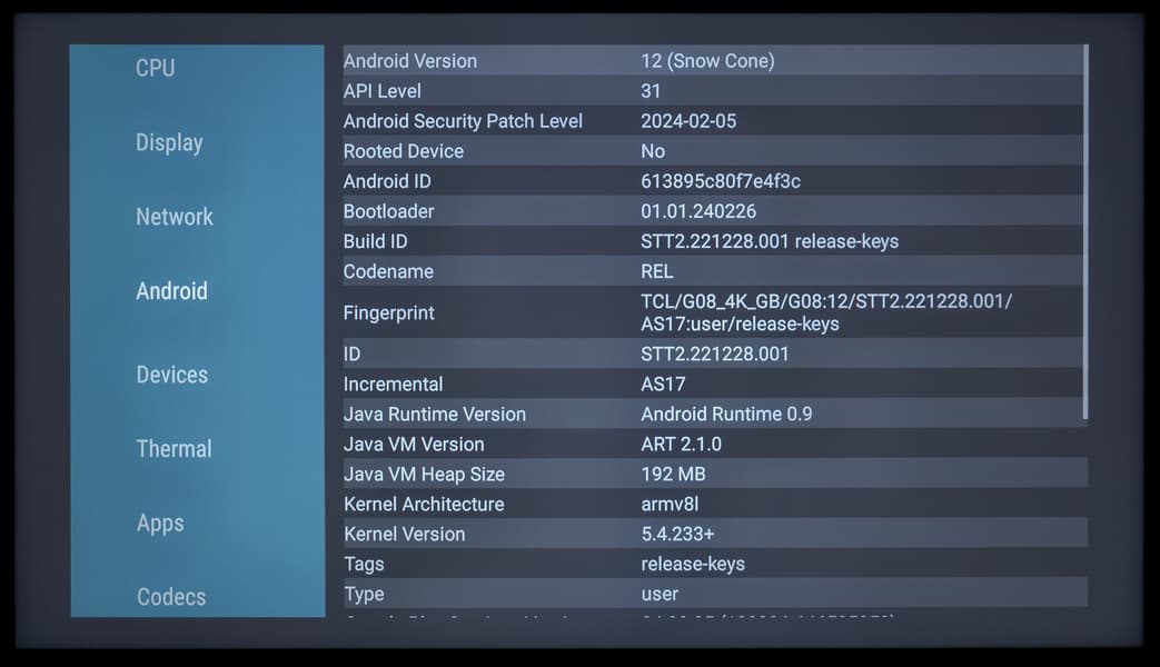 Рассматриваемый телевизор TCL 85C855 работает под управлением платформы Google TV, в данном случае основанной на Android версии 12 (она же обозначается производителем как Android Snow Cone) с последним доступным обновлением на конец июня 2024 года.