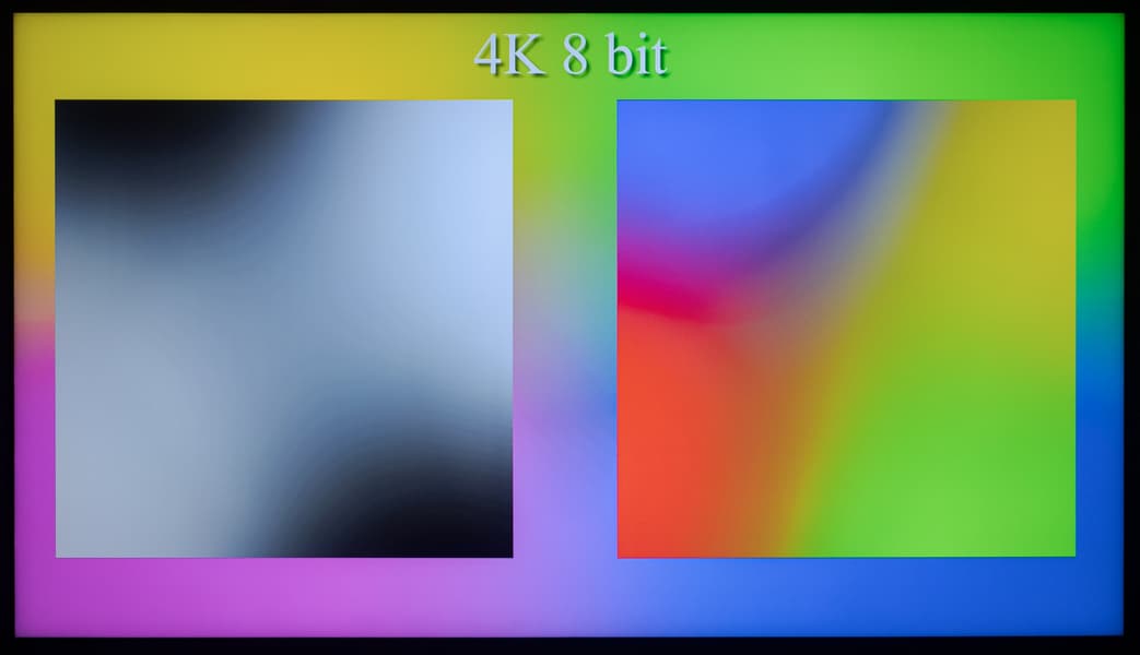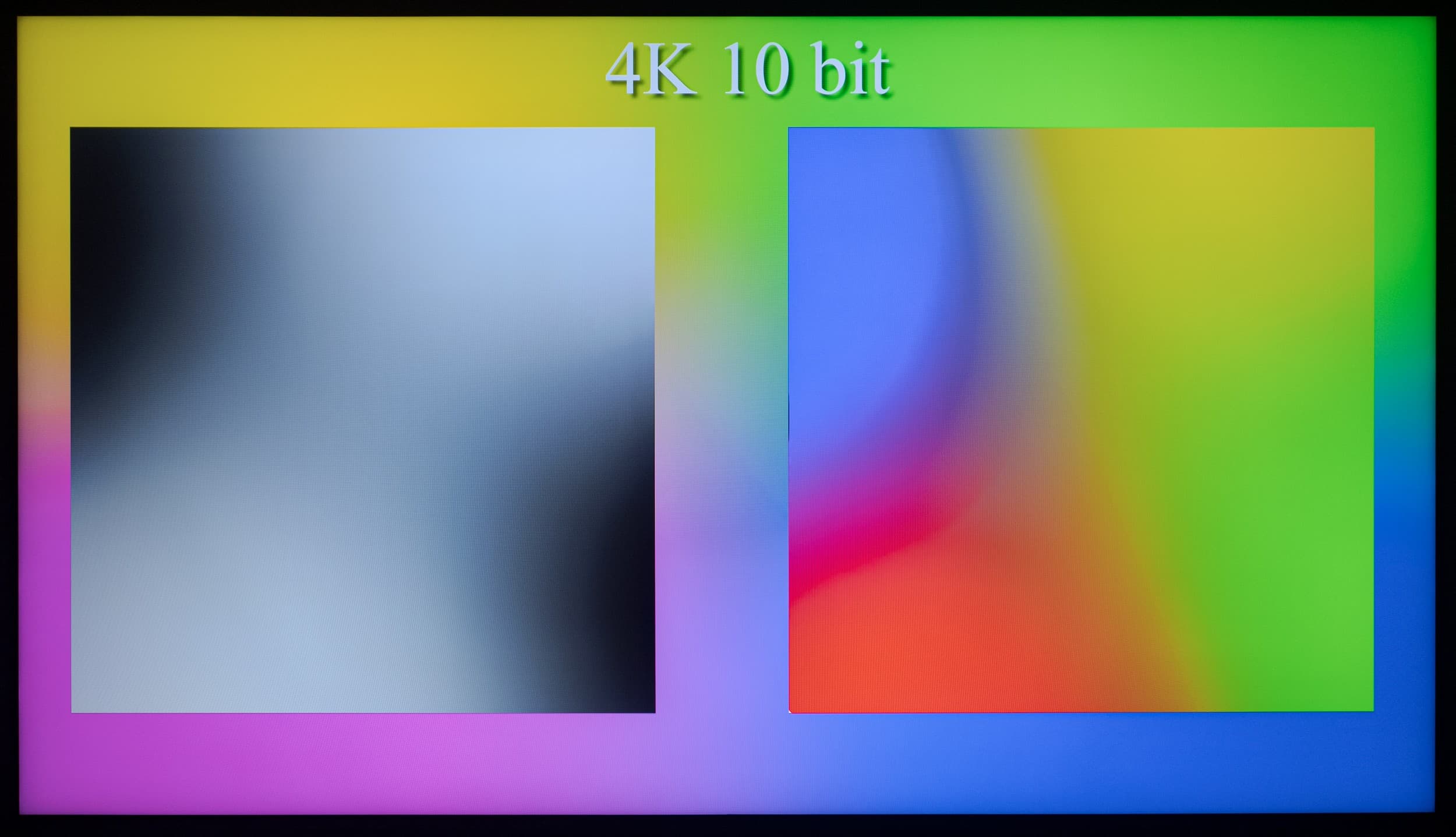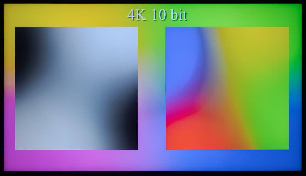 Наглядно видно, что телевизор способен выводить градиенты в 10-битном режиме более качественно, чем в стандартном 8-битном. Но в большей степени это будет актуально при выводе HDR-контента с соответствующими требованиями к ТВ. Использование же программной эмуляции до 12 бит через драйвер видеокарты не приносит видимых преимуществ над 10-битным выводом сигнала.