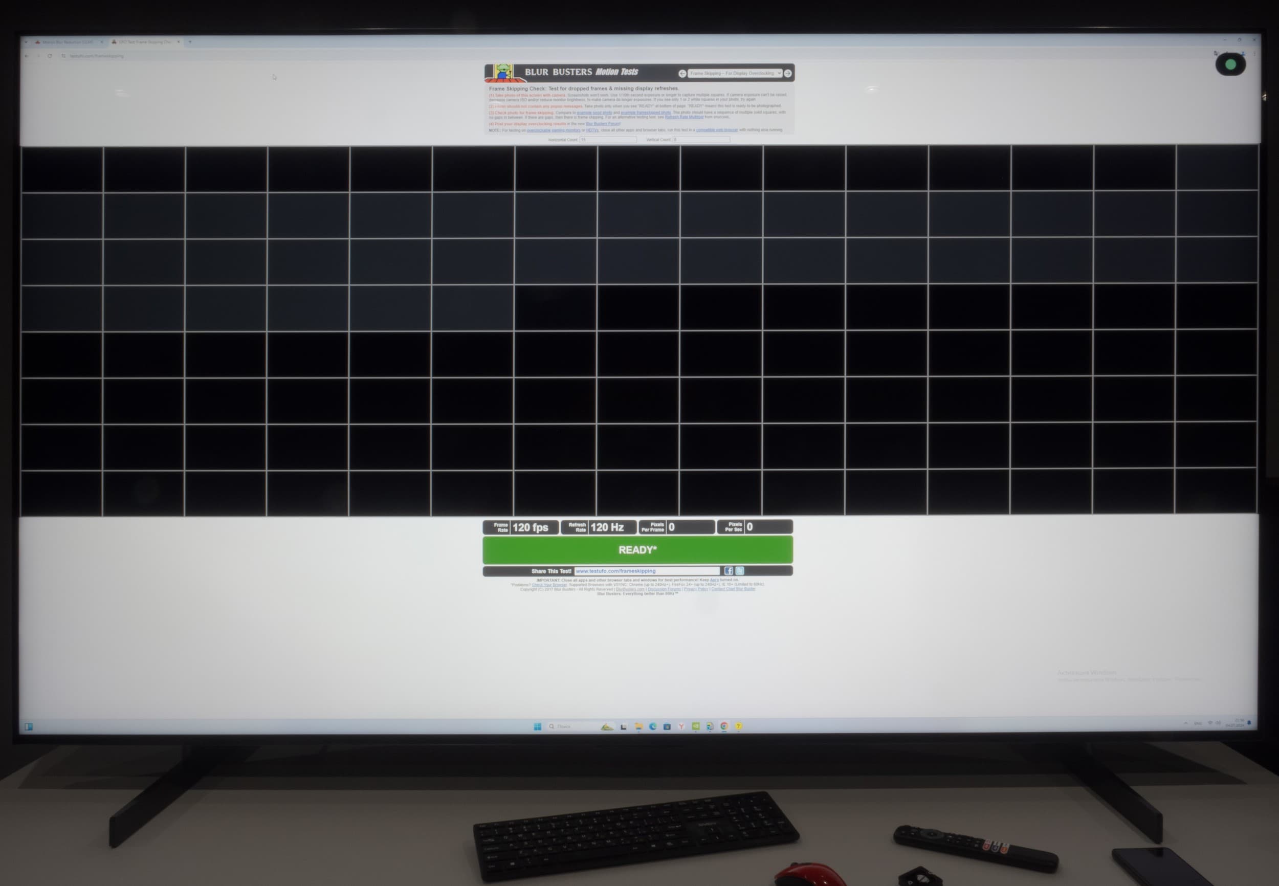 Тестирование на пропуск кадров мы провели при подключении ТВ к ПК. Использовался классический тест из набора TestUFO. Здесь можно отметить, что на 120 Гц у TCL 85C855 проблем нет: пропуск кадров отсутствует.