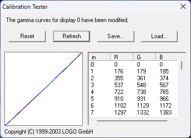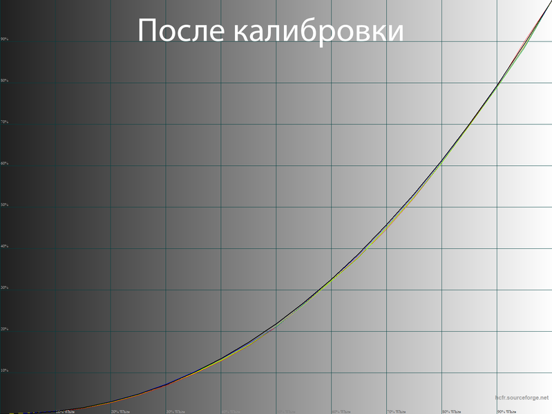 Правки в LUT видеокарты позволили скорректировать недостаточно корректные гамма-кривые в средней части и выйти на необходимый уровень точности. Среднее значение гаммы в этом случае составило 2,21.