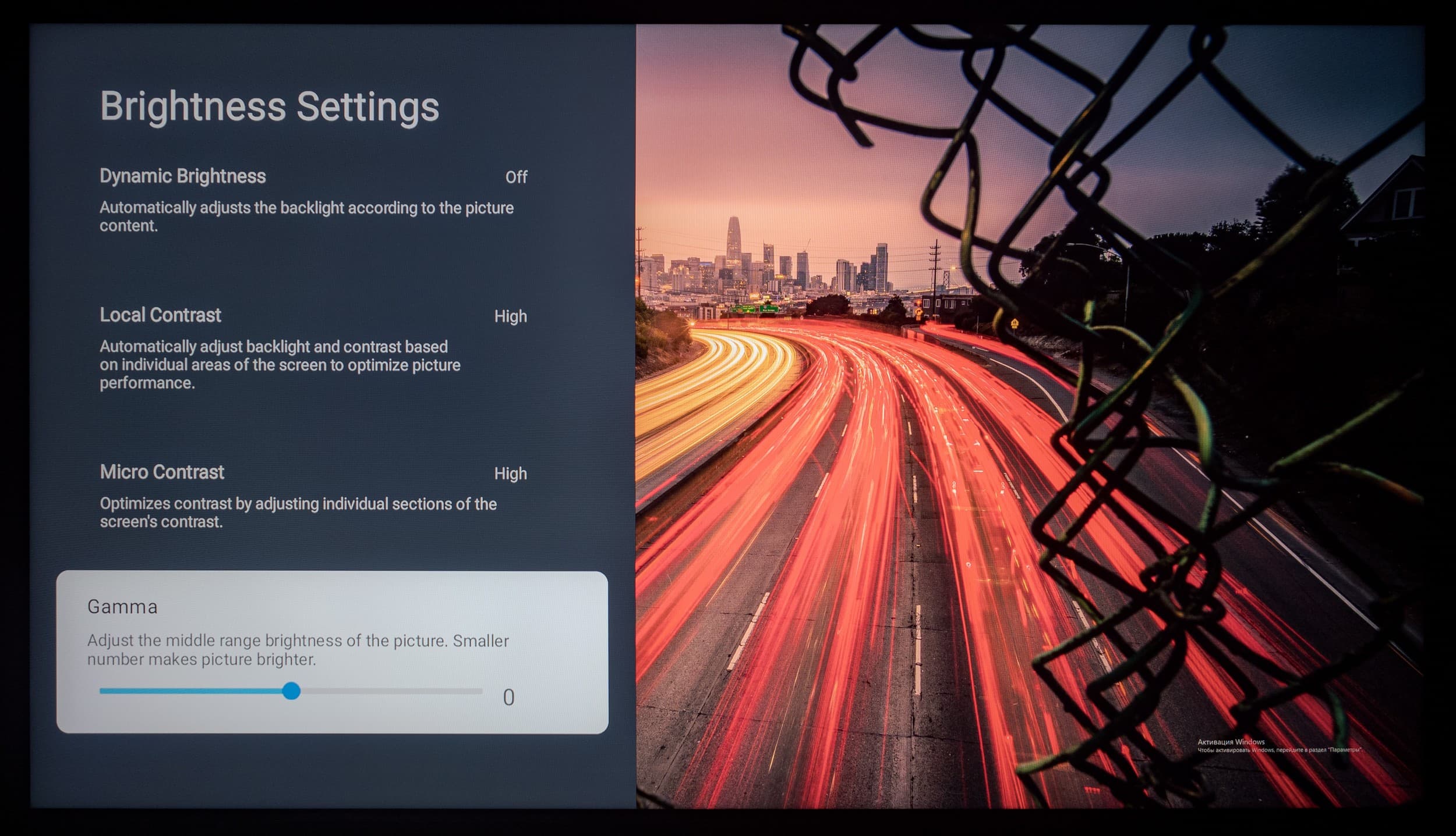 Тут мы можем отметить, что регулировка гаммы у телевизора TCL выполняется корректно и достаточно плавно. Вы можете легко и быстро воздействовать на глобальную коррекцию контрастности изображения и добиться полностью устраивающего вас результата, затратив не более 1-2 минут.