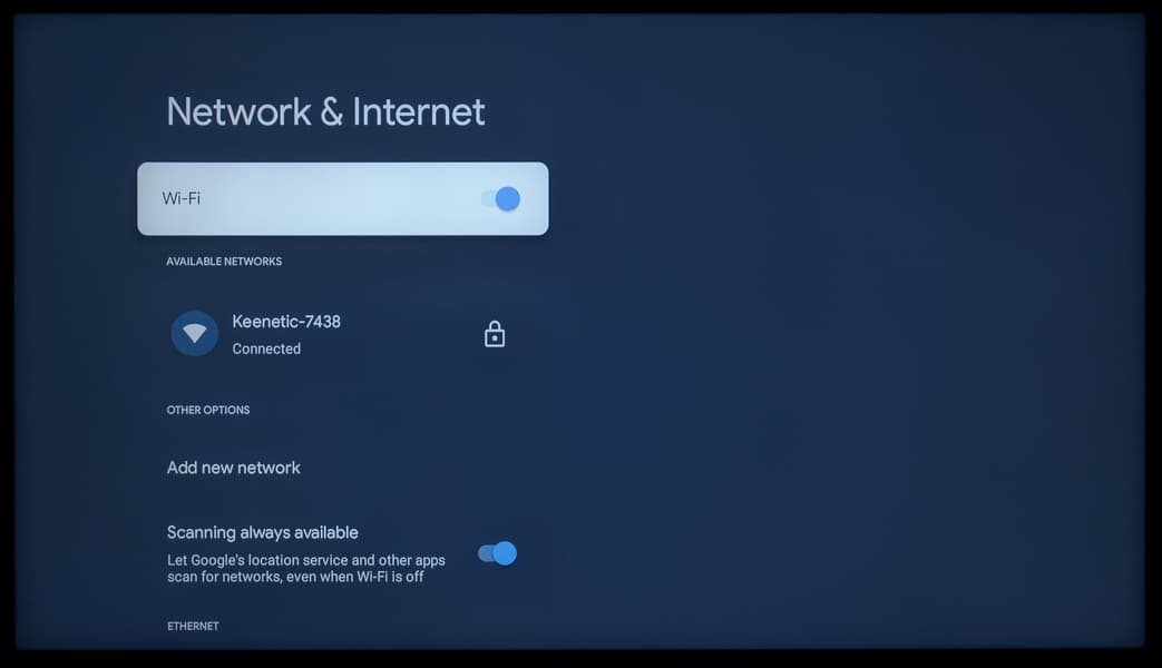 В развернутой сети 2,4/5 ГГц на базе роутера Keenetic Hopper (KN-3810), при нахождении телевизора в 5 метрах по прямой от него с преградой в виде монолитной стены, телевизор TCL продемонстрировал стабильную скорость подключения в 420 Мбит/c (тип подключения — 11ac/k/r/v, 2×2, 80 МГц), которая иногда поднималась еще выше. Это очень достойный результат, который, впрочем, мы смогли получить лишь после принудительного переключения на канал 5 ГГц. В противном случае модель TCL постоянно «просилась в гости» на канал 2,4 ГГц со значительно меньшей скоростью.