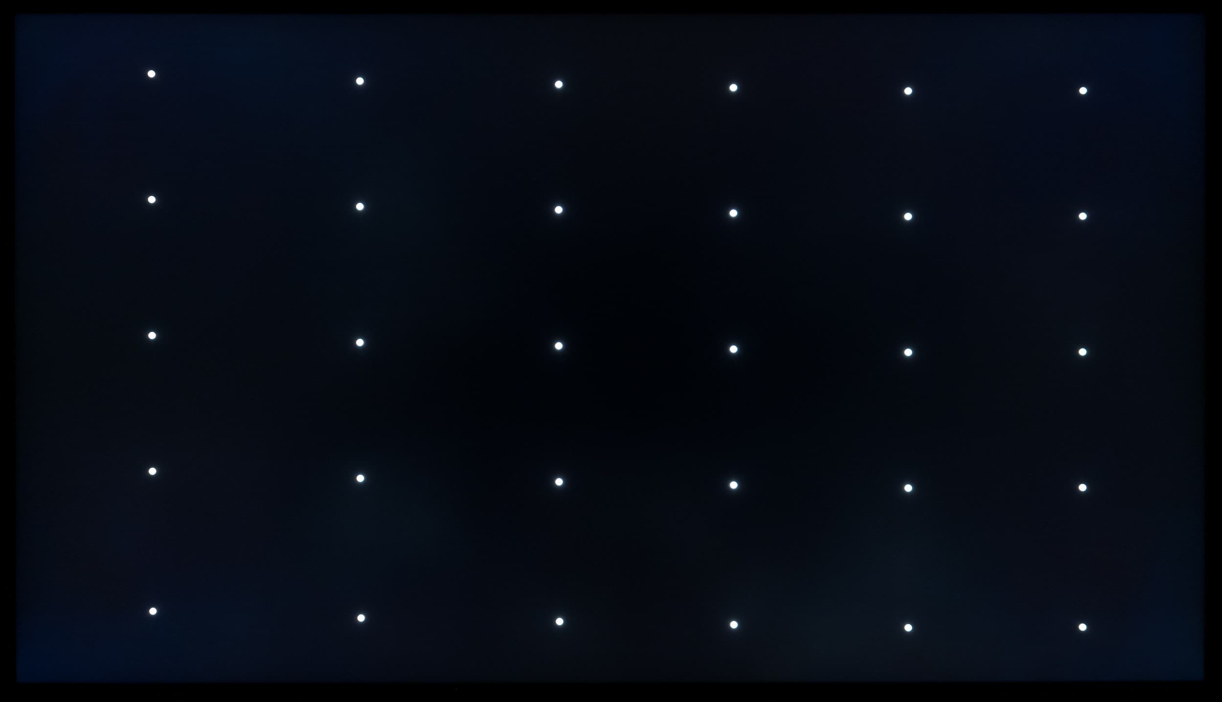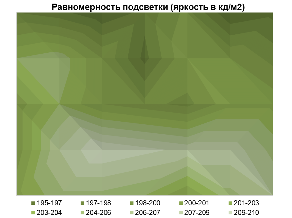 Измерения яркости проводились в 35 точках экрана, расположенных с шагом 1/6 от ширины и высоты экрана. Границы экрана не включены, настройки установлены в значения, обеспечивающие яркость белого поля в 200 нит в центральной части экрана.