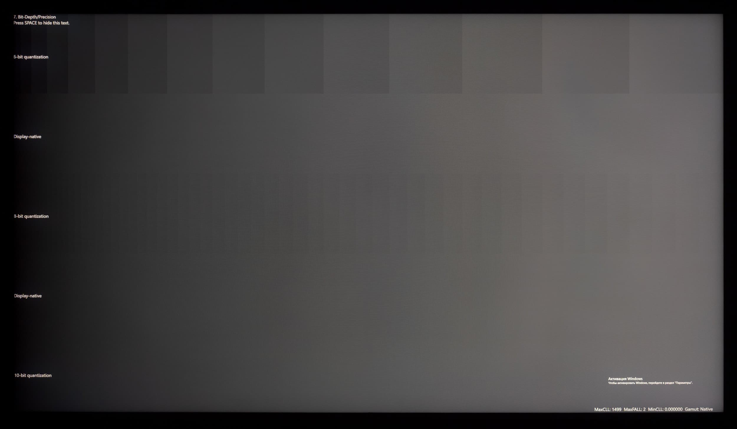 Качественную оценку мы начнем с демонстрации градиентов при выводе изображения в 8-битном и 10-битном режимах (программная эмуляция со стороны ТВ либо GPU в случае подключения к ПК/ноутбуку).
