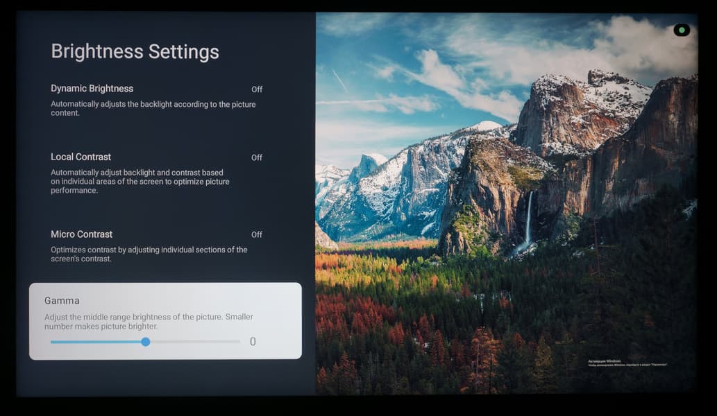 Тут мы можем отметить, что регулировка гаммы у телевизора TCL выполняется корректно и достаточно плавно. Вы можете легко и быстро воздействовать на глобальную коррекцию контрастности изображения и добиться полностью устраивающего результата, затратив не более 1-2 минут своего времени.