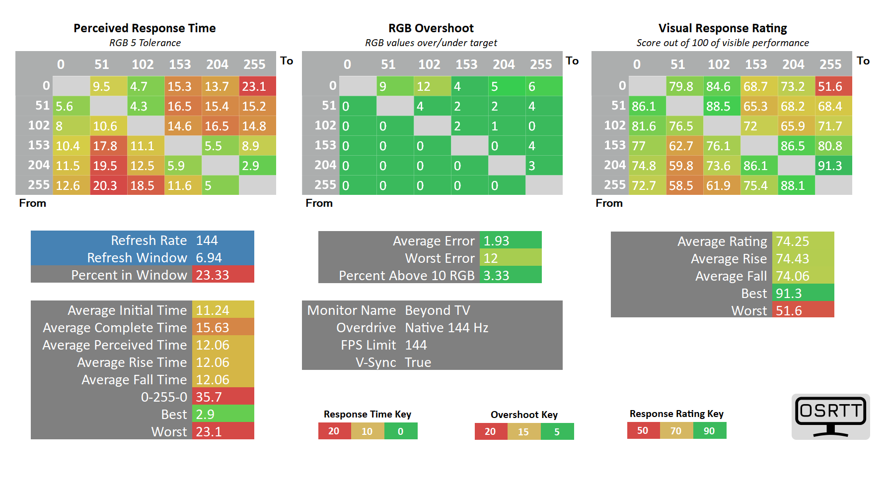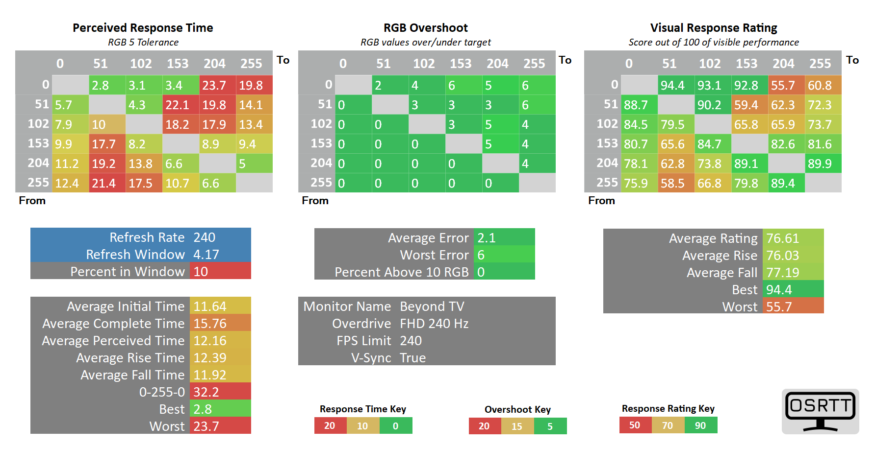 Выше приведены результаты измерения программно-аппаратным комплексом OSRTT, для которого в качестве референсного метода оценки скорости отклика выбран строгий допуск RGB 5 после нормализации значения гаммы в ходе автоматической оценки заводского значения. Данный вариант оценки скорости задает более «жесткие стандарты», чем свойственны для методики измерений со стороны производителей (10%—90% времени перехода по уровню яркости, без учета различий гаммы и артефактов).