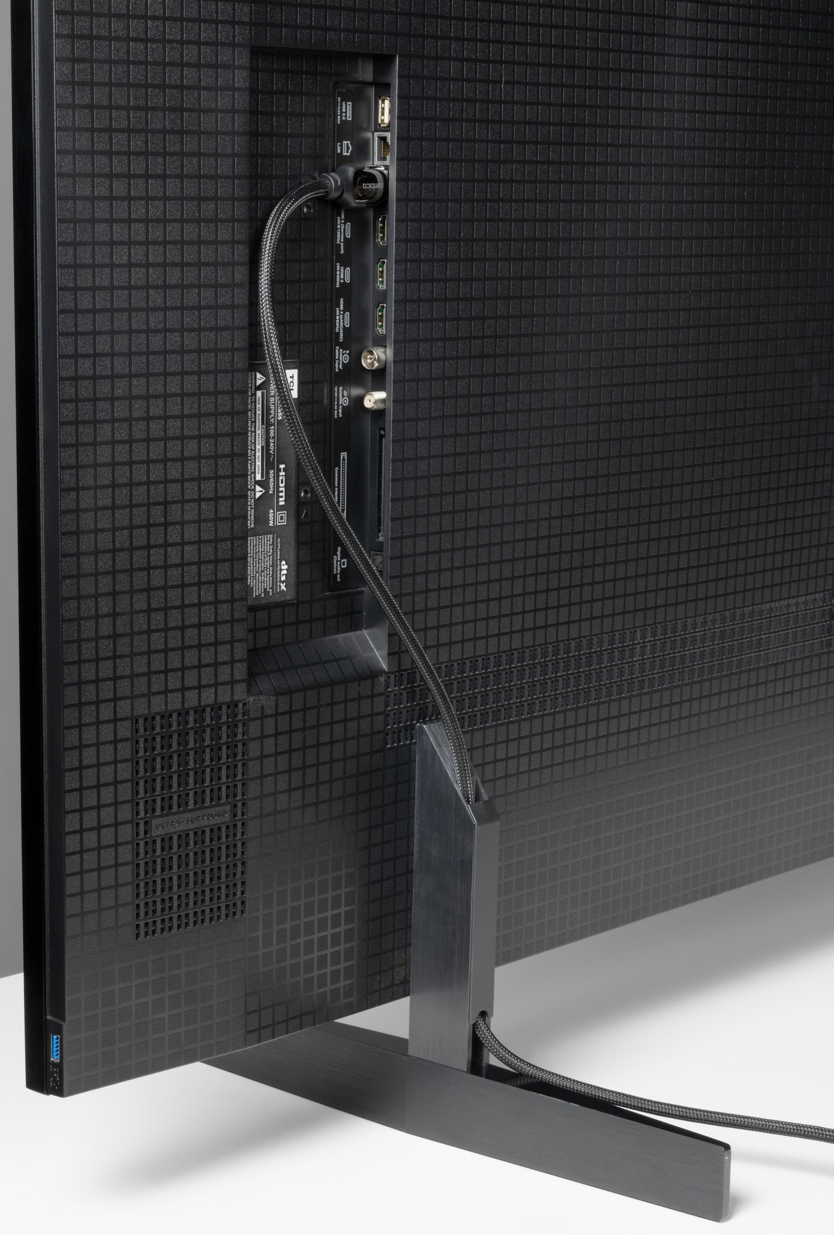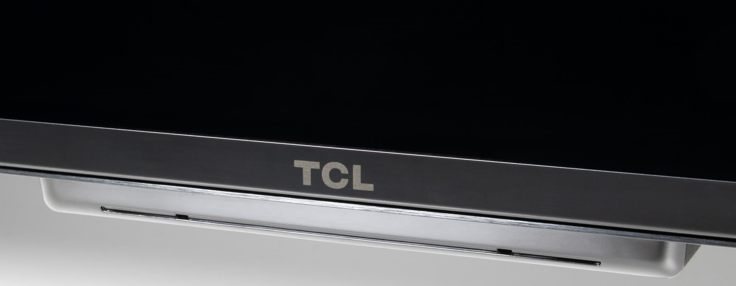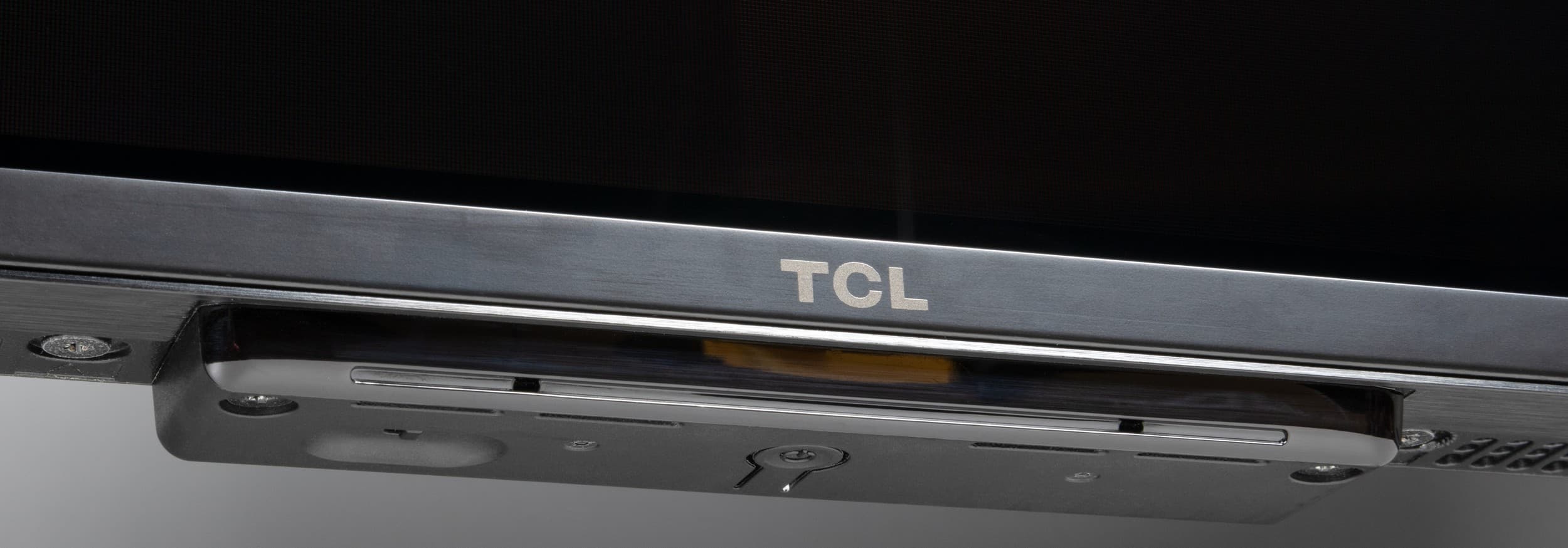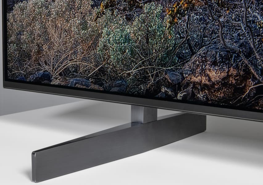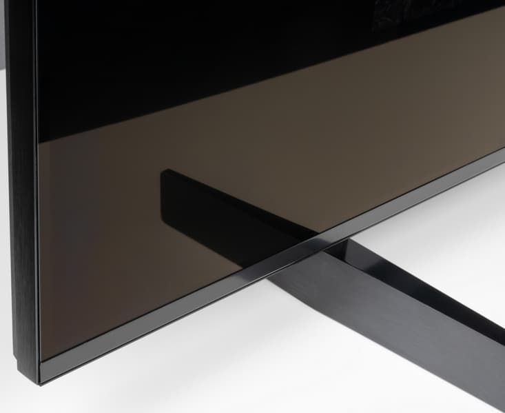 Штатная подставка модели TCL 85X955 состоит из двух отлитых из алюминия и покрашенных темно-серой краской Т-образных ножек. Они крепятся винтами из комплекта поставки к задней части корпуса, а места креплений закрываются декоративными тонкими пластиковыми накладками.