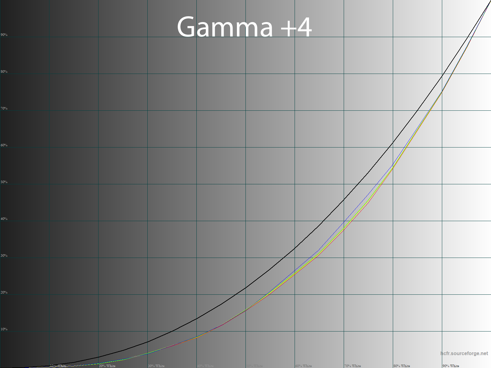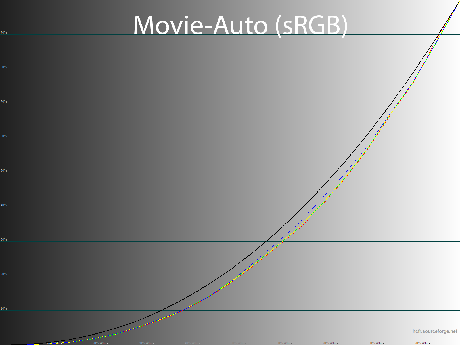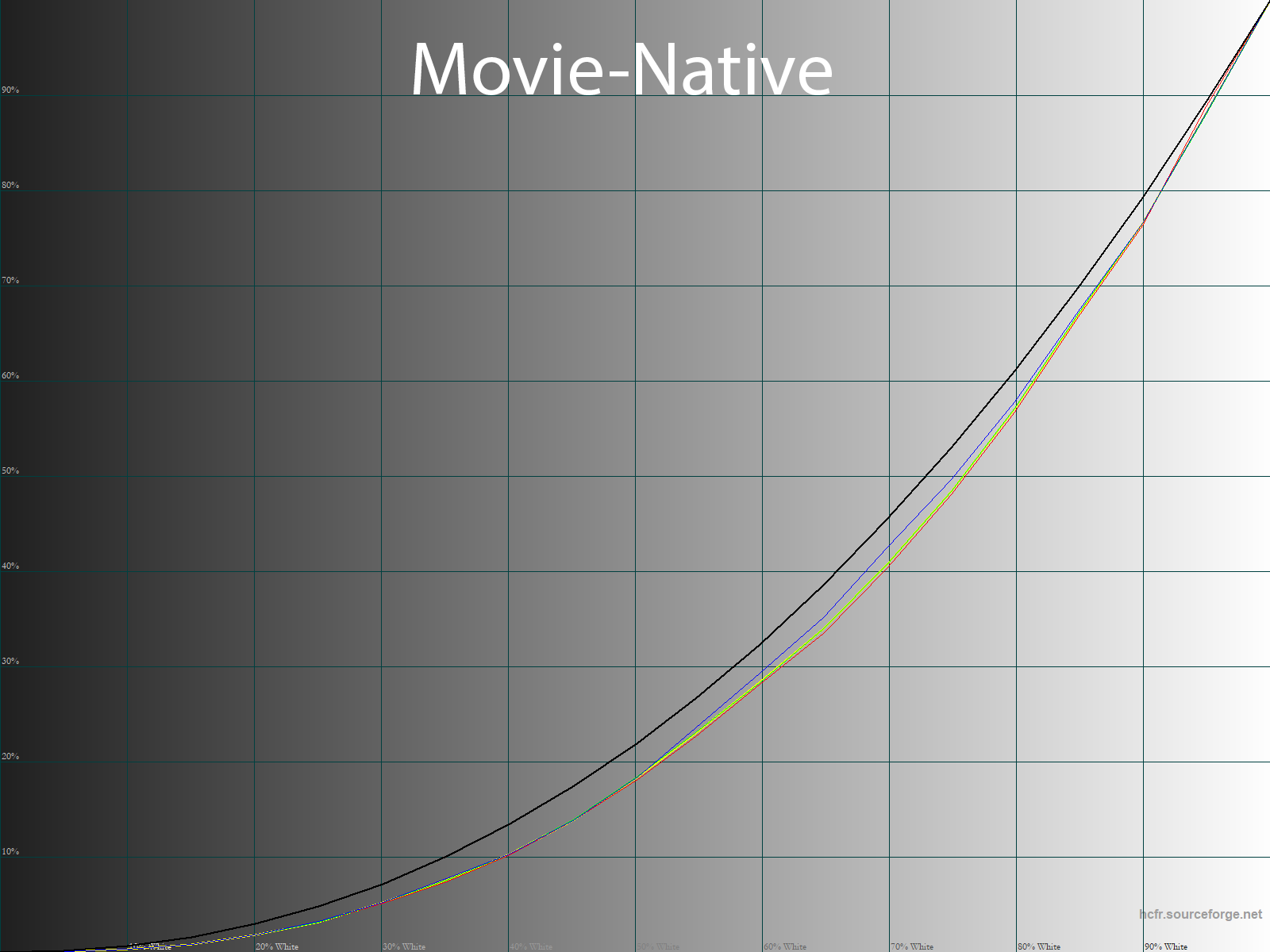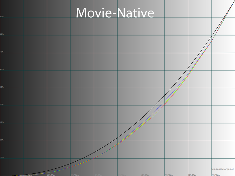 Ниже приведен спектр для белого поля (белая линия), наложенный на спектры красного, зеленого и синего полей (линии соответствующих цветов) для режима экрана «Movie — Native» с полной цветовой гаммой: