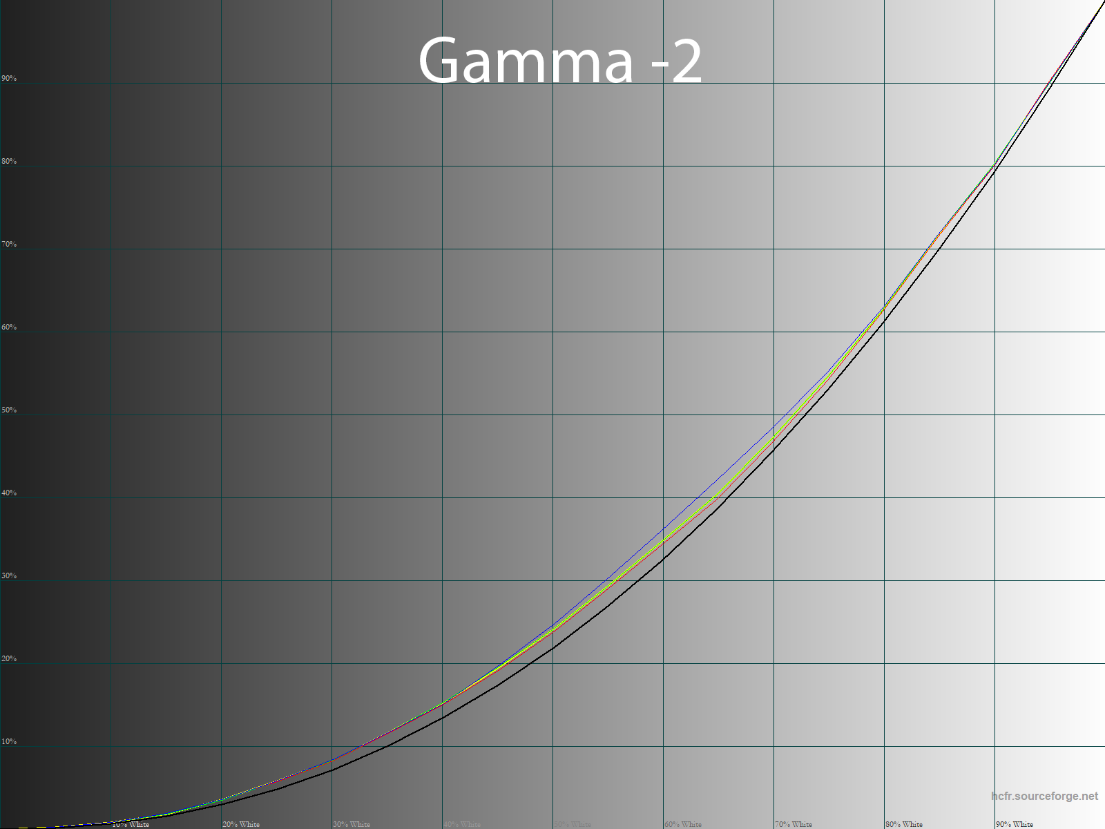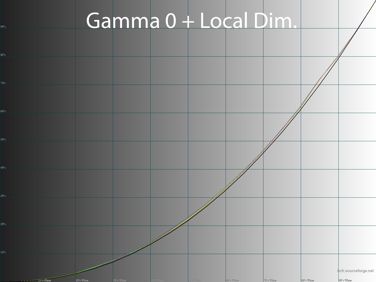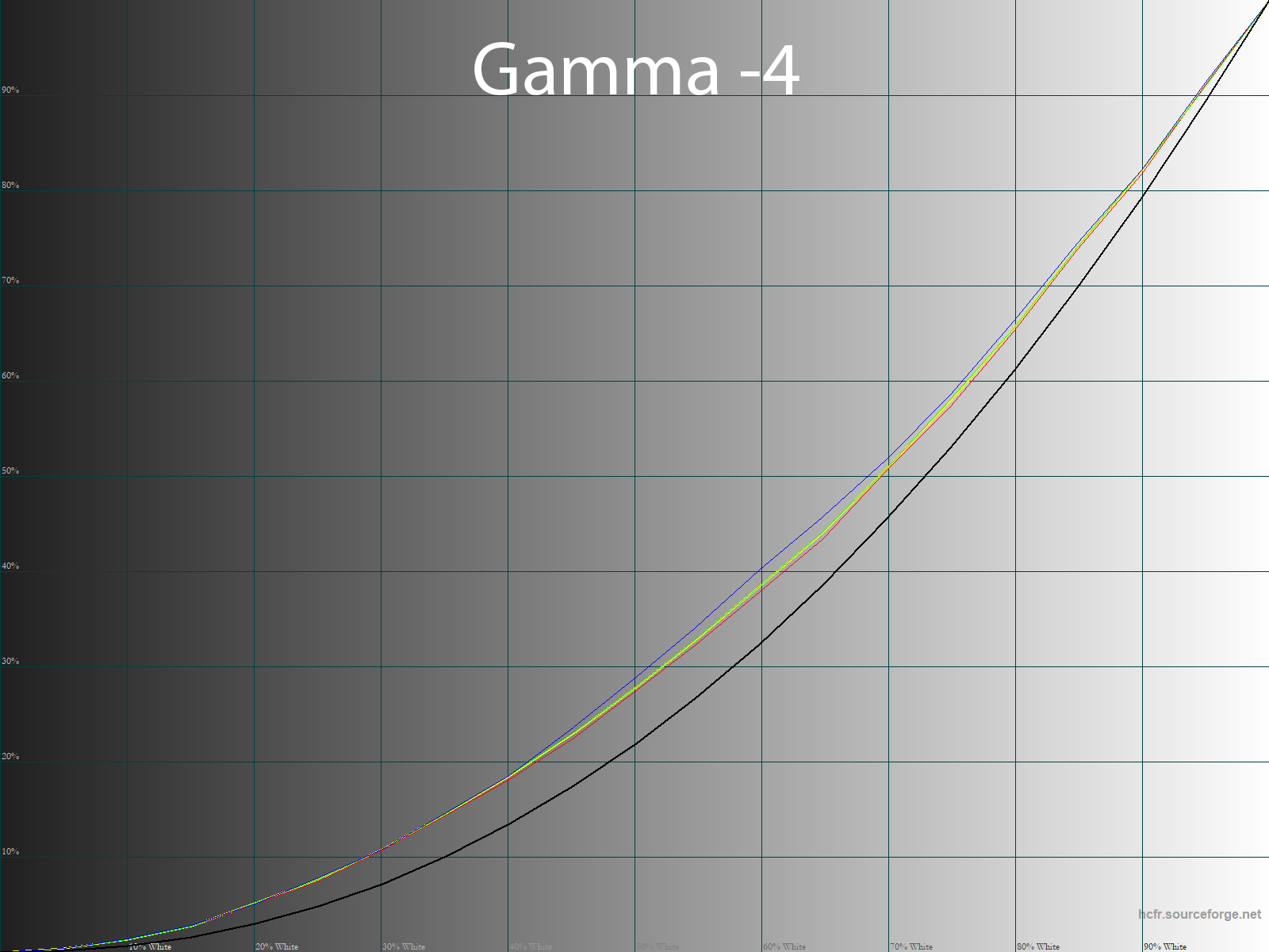 Ниже приведен спектр для белого поля (белая линия), наложенный на спектры красного, зеленого и синего полей (линии соответствующих цветов) для режима экрана «Movie — Native» с полной цветовой гаммой: