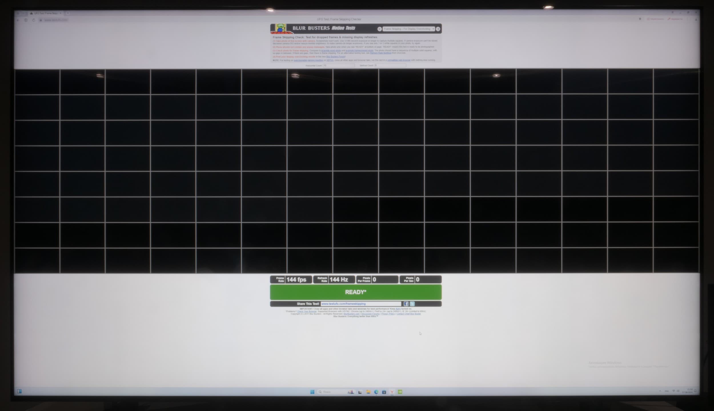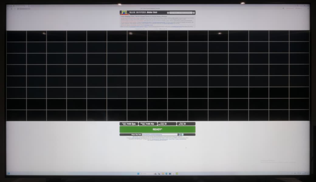 Тестирование на пропуск кадров мы провели при подключении ТВ к ПК. Использовался классический тест из набора TestUFO. Здесь можно отметить, что на 144 Гц у TCL 85X955 проблем нет — пропуск кадров отсутствует.