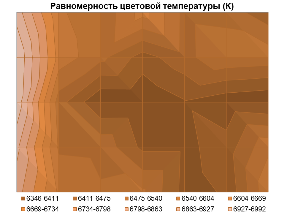 Не сильно хуже показал себя телевизор в схожих условиях проверки и по стабильности ЦТ по площади экрана: среднее отклонение от центральной точки составило 3,3%, максимальное 10,1%, а вариация значений по полю экрана лишь слегка превысила установленные в качестве допустимого уровня 600 К, что является очень высоким результатом, особенно для 85-дюймовой модели.