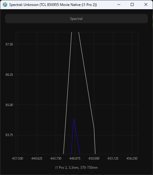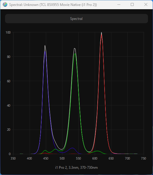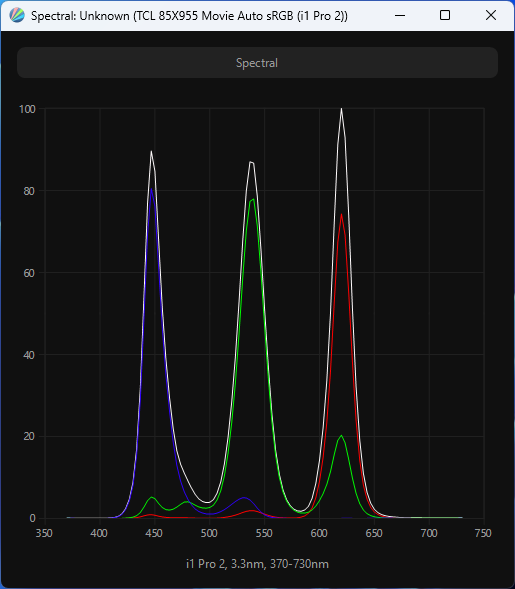 Виден пик синего, приходящийся на 447 нм, что не способно обеспечить экран различными современными сертификатами безопасности. Перекрестное подмешивание компонент незначительное. Полученный спектр подтверждает использование в системе подсветки так называемых «квантовых точек», а в условиях применения локальной системы управления яркостью на базе Mini-LED маркетинговое название QD-Mini-LED имеет право на существование. Цветовой охват расширен и приближен не только к кинотеатральному DCI-P3, но и к полиграфическому AdobeRGB.