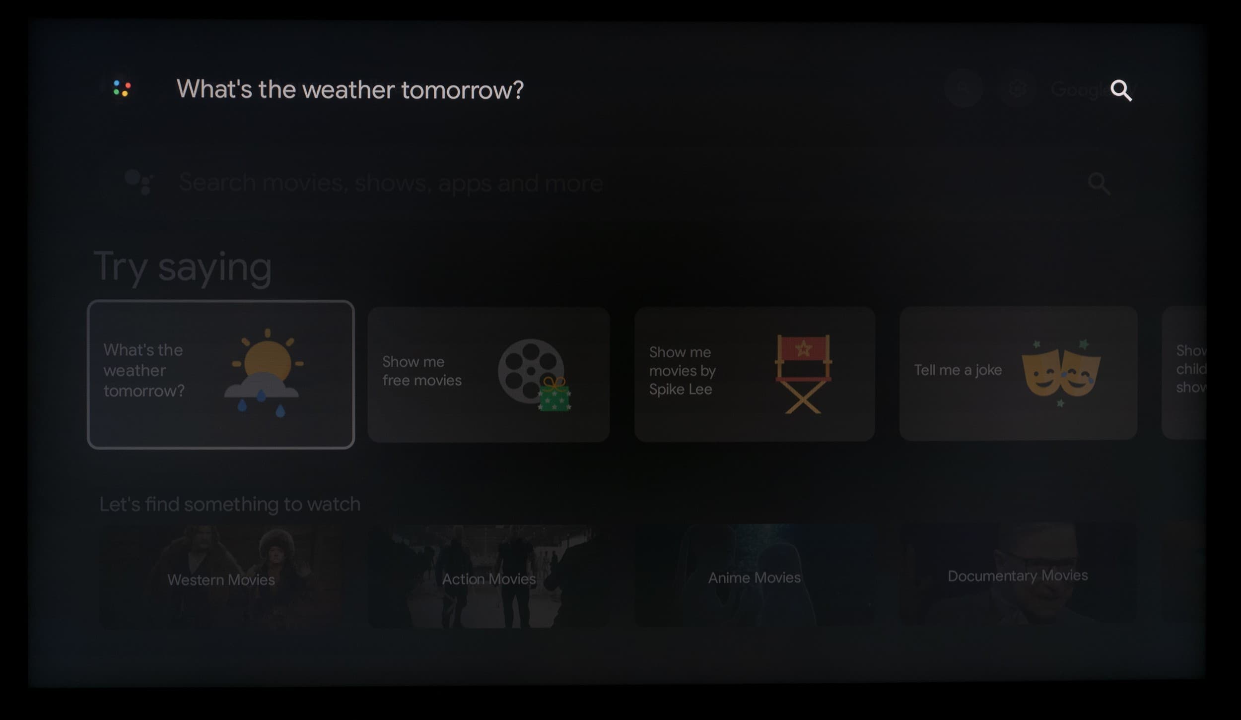 В передней части пульта рядом с индикатором есть отверстие микрофона. Голосовой помощник Google запускается при нажатии на кнопку с разноцветным микрофоном (для ввода голосовой команды держать ее не нужно), также его можно запустить с домашней страницы или нажатием на мультимедийную кнопку поиска на цифровой клавиатуре. Этот помощник поможет найти контент, который предоставляют ряд программ, и ответить на какие-то вопросы (показывает и проговаривает ответ), например, какая сейчас погода за окном. Пульт желательно держать поближе к себе, поскольку встроенный в пульт ДУ микрофон не является высокочувствительным.