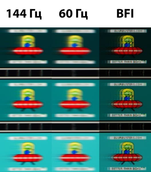 Для наглядного представления о том, что на практике означает такая скорость матрицы, приведен снимок выше, полученный с помощью движущейся камеры. Подобные снимки показывают, что видит человек, если он следит глазами за двигающимся на экране объектом. Очевидно, что переход от классических 60 Гц к 144 Гц приносит ощутимые изменения — визуально сильно увеличивается плавность всего происходящего на экране. Однако это актуально только в случае подключения к ПК или игр на игровых консолях, которые могут выдать соответствующий уровень fps.