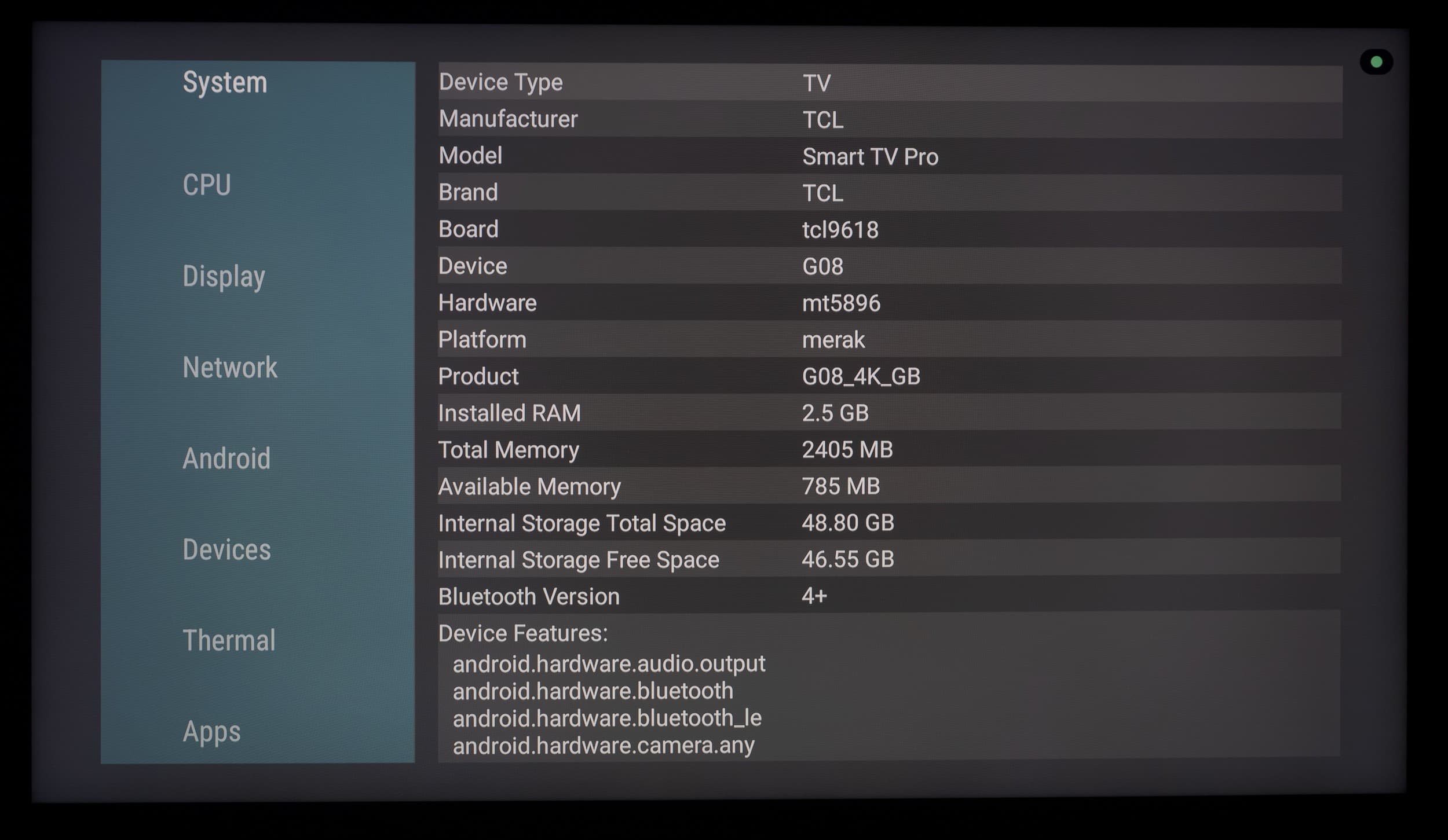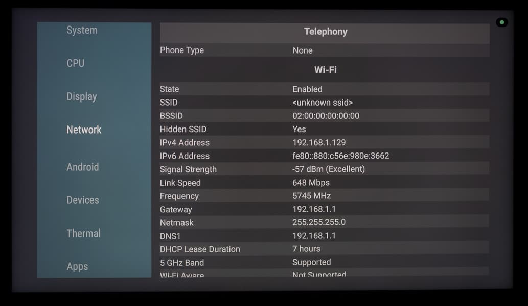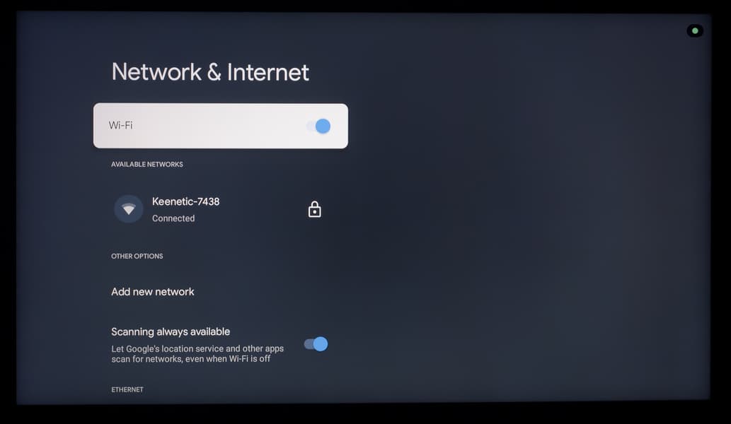 В развернутой сети 2,4/5 ГГц на базе роутера Keenetic Hopper (KN-3810), при нахождении телевизора в 5 метрах по прямой от него с преградой в виде монолитной стены, телевизор TCL продемонстрировал стабильную скорость подключения в 640 Мбит/c (тип подключения — 11ac/k/r/v, 2×2 80 МГц), которая иногда становилась выше.
