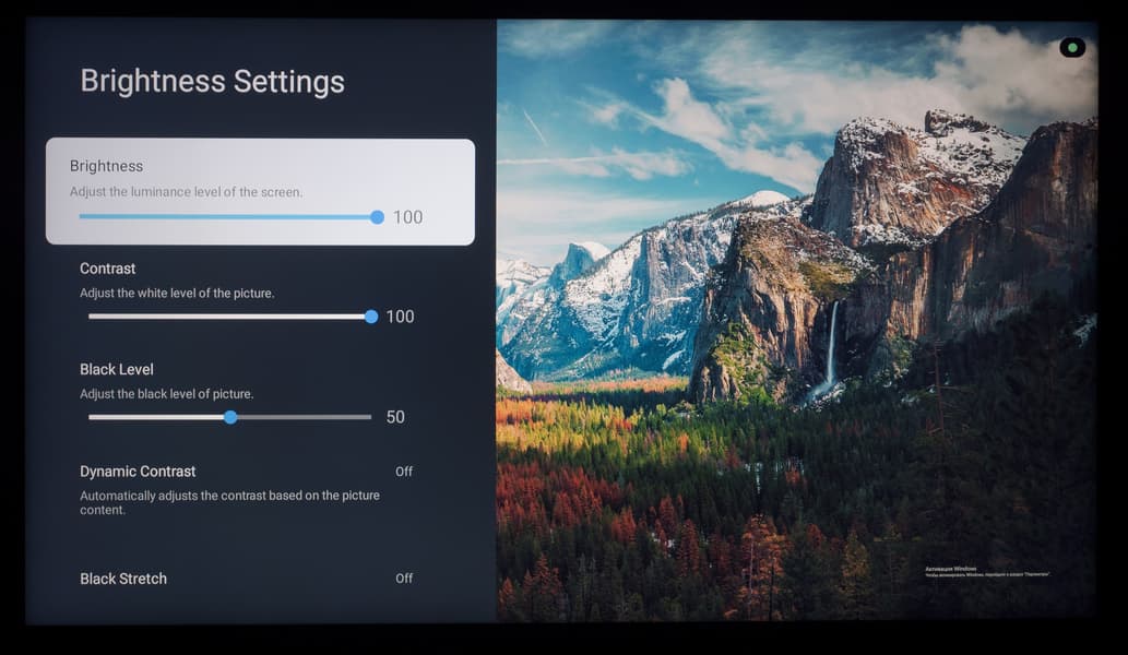 Что же касается минимальной яркости в SDR без локального управления яркостью, то в зависимости от выставленного режима она составила 65-78 нит, чего вполне достаточно для комфортного просмотра (без лишней нагрузки на глаза) в условиях отсутствия внешнего освещения — в полностью затемненной комнате.