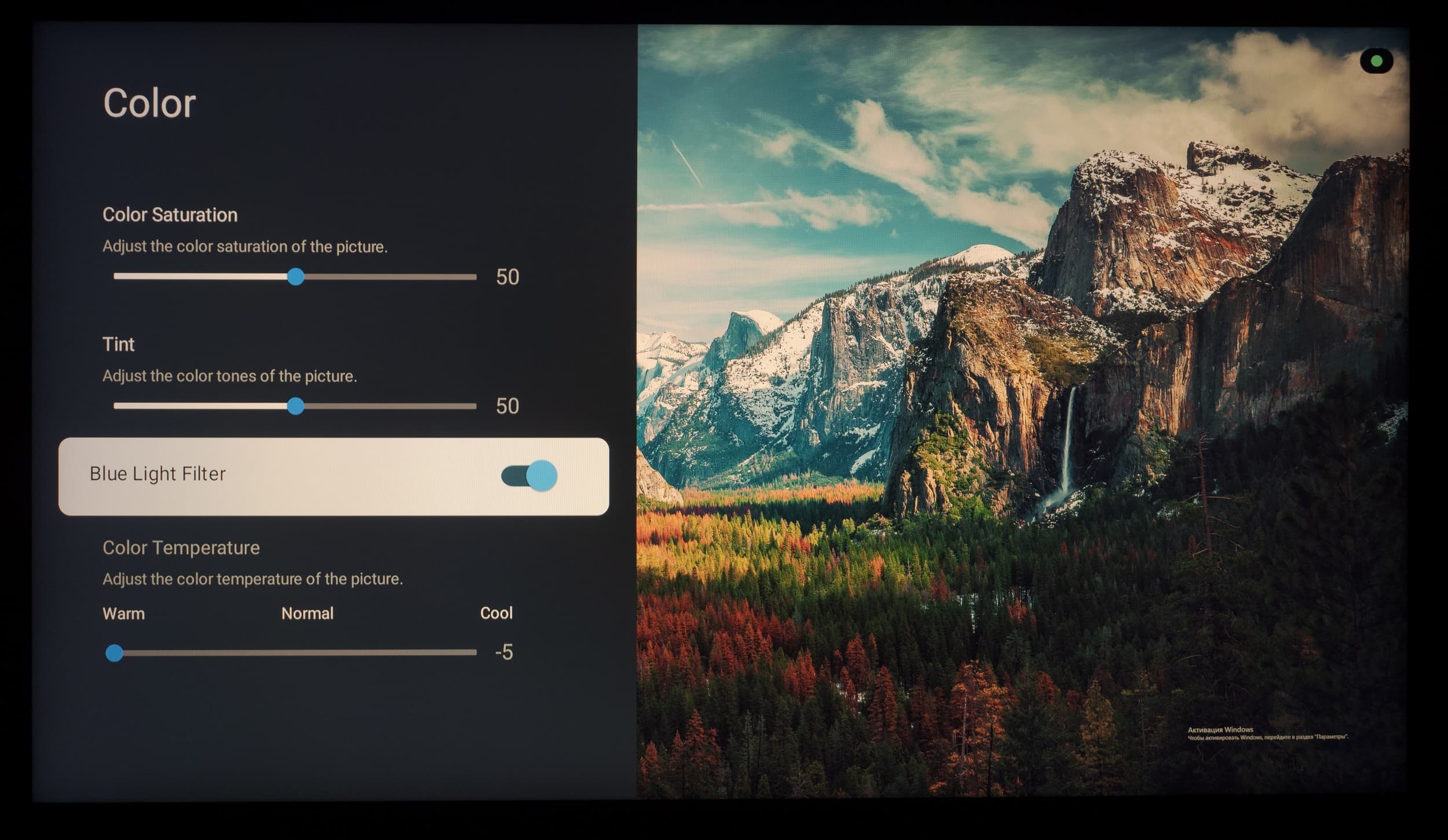 После активации всех «помощников» по затемнению, черное поле сильно преображается. Зрительно экран как будто выключен и лишь область курсора мышки и предупреждение Windows выдают работу ТВ.