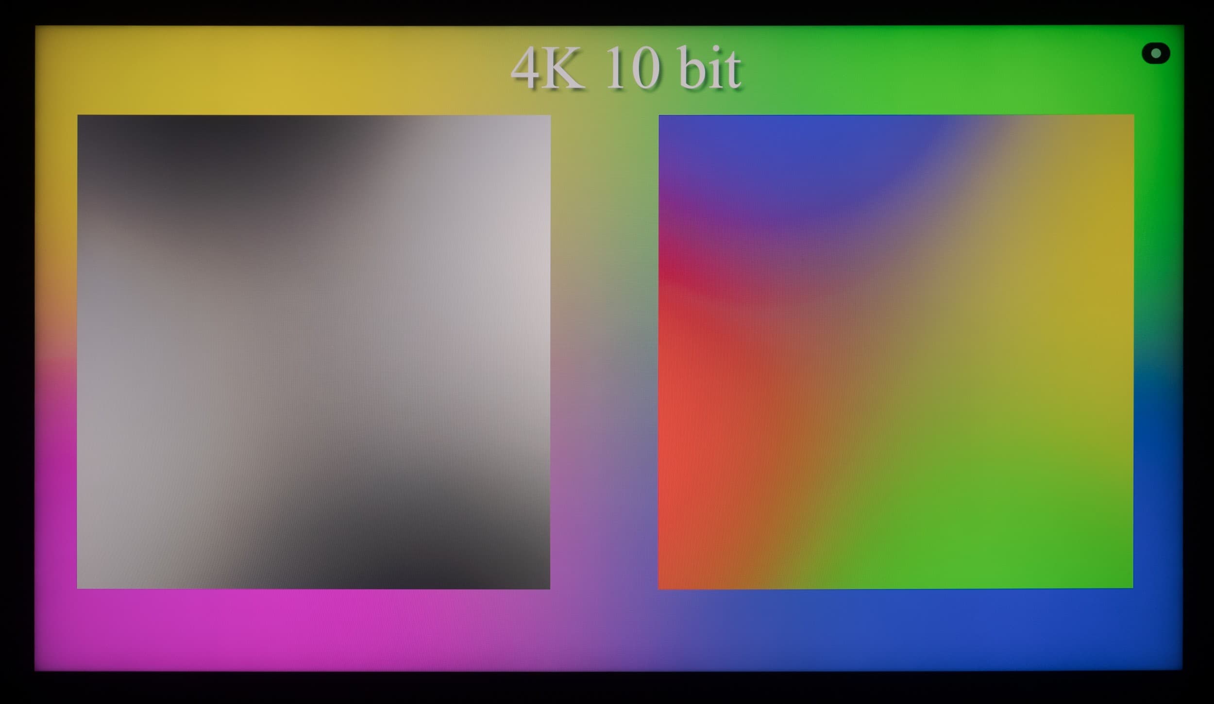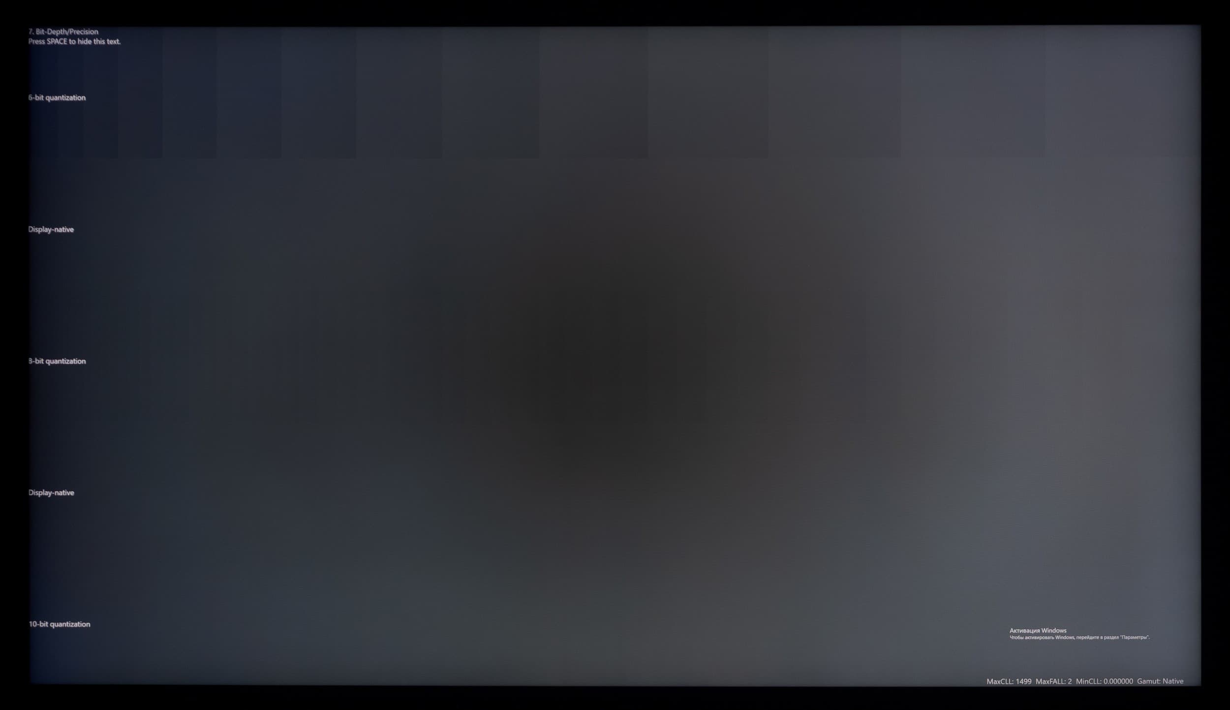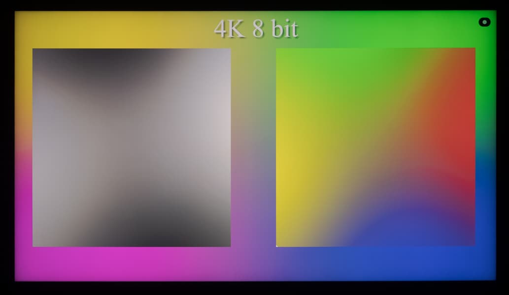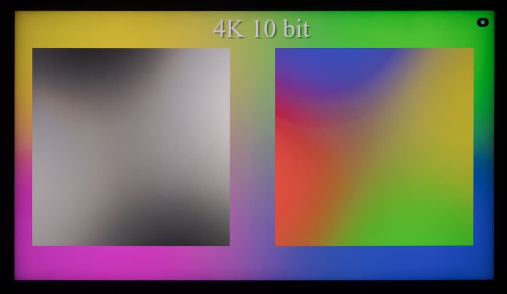 Наглядно видно, что телевизор способен выводить градиенты в 10-битном режиме более качественно, чем в стандартном 8-битном. Но в большей степени это будет актуально при выводе HDR-контента с соответствующими требованиями к ТВ. Использование же программной эмуляции до 12 бит (при снижении частоты обновления) через драйвер видеокарты не приносит видимых преимуществ над 10-битным выводом сигнала.