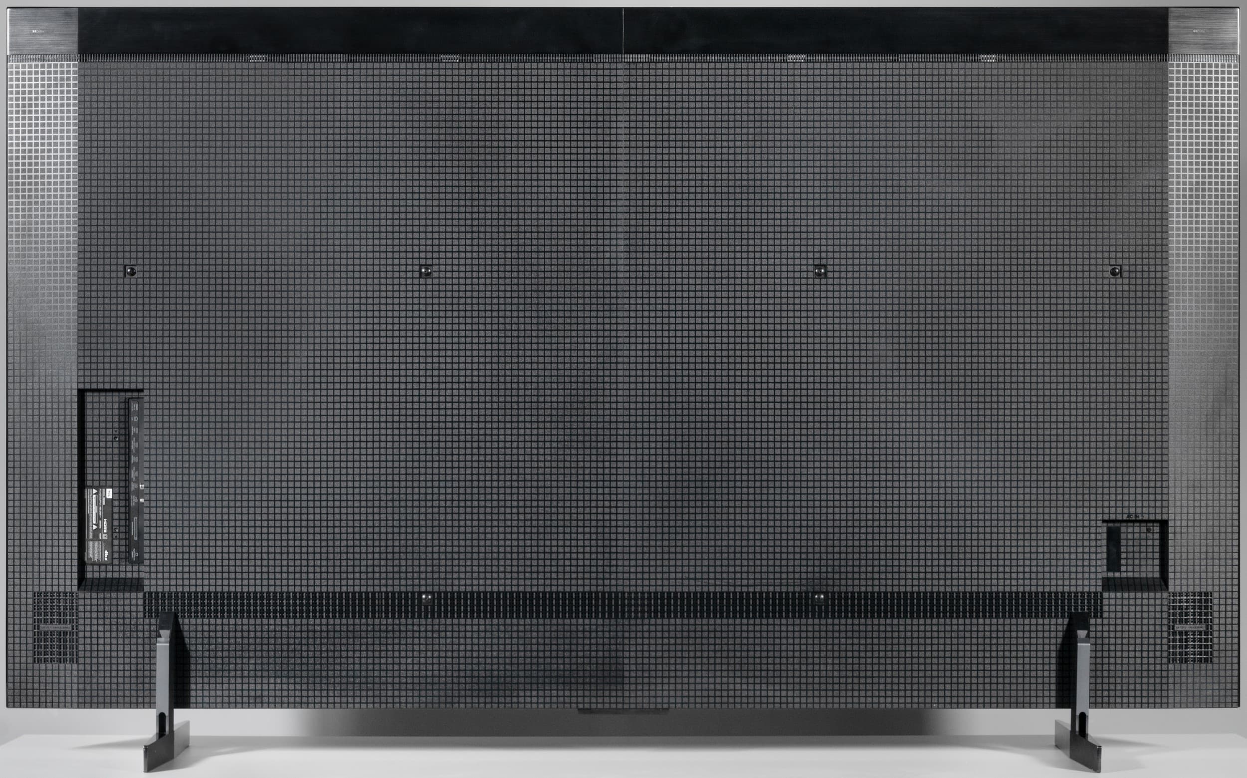 Сзади телевизор выглядит крайне аккуратно. Практически вся задняя панель изготовлена из качественного толстого пластика с фактурным рисунком в виде вертикально выстроенных прямоугольников на более темной серой подложке. Сверху есть переход к пластиковой накладке с имитацией шлифованного металла, которая визуально добавляет продукта изысканности.