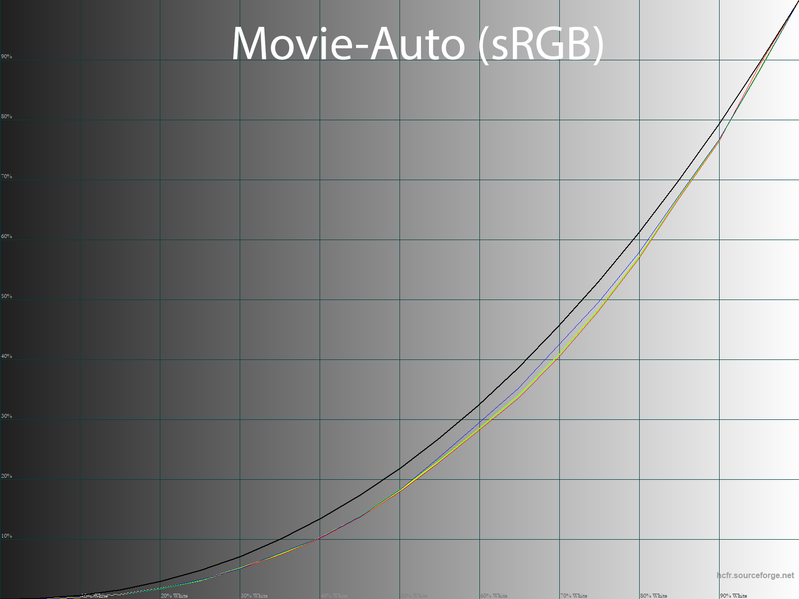 Гамма-кривые также установлены на уровне выше среднего — гамма со средним значением 2,43-2,48 для каждого из режимов. Везде выражен провал в тенях при визуальной оценке, а общая контрастность явно увеличена, дисбаланс RGB при этом фактически отсутствует. Выходит, что тут есть над чем поработать.