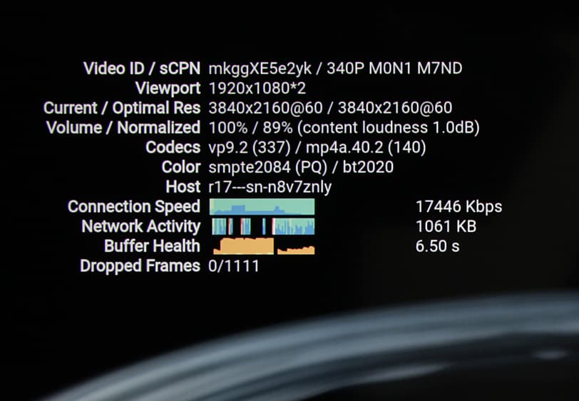 В категории распространенных форматов медиаплеер телевизора не поддерживает воспроизведение видеопотока MPEG4 ASP в контейнерах AVI, DIVX и MKV, и поддерживает в случае mp4, также, например, не воспроизводятся файлы WMV. На практике это означает, что могут быть проблемы с воспроизведением устаревших видеофайлов низкого разрешения, но современные файлы высокого разрешения проигрываться будут с очень большой вероятностью, в частности вплоть до H.265 с разрешением UHD при 60 кадр/с. Поддерживаются несколько звуковых дорожек в разнообразных форматах, а также внешние и встроенные текстовые субтитры (русские должны быть в кодировке Windows-1251 или в Unicode). Аудиодорожки DTS не воспроизводятся, что не очень хорошо. Тестовые ролики на определение равномерности чередования кадров помогли выявить, что телевизор при воспроизведении видеофайлов подстраивает частоту обновления экрана под частоту кадров в видеофайле, даже в случае файлов с 24 кадр/с, что сейчас встречается не очень часто. Максимальный битрейт видеофайлов, при котором еще не было артефактов, при воспроизведении с USB-носителей составил как минимум 90 Мбит/с (не было тестовых файлов с большим битрейтом), по проводной сети Ethernet — 60 Мбит/с, а по Wi-Fi (2,4 ГГц) — 70 Мбит/с. В двух последних случаях использовался медиасервер роутера Asus RT-AC68U. Статистика на роутере показывает, что скорость приема составляет до 144,4 Мбит/с, поэтому, скорее всего, в телевизоре установлен адаптер 802.11b/g/n. Поддерживаются видеофайлы с кодировкой 10 бит на цвет, при этом вывод изображения осуществляется также с высокой битностью, что подтверждают специальные тестовые файлы с градиентами.