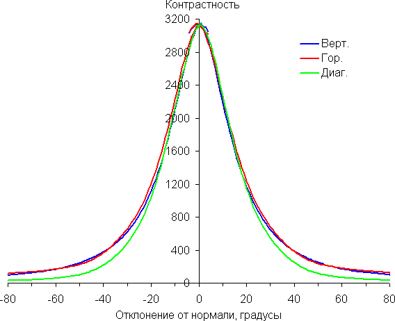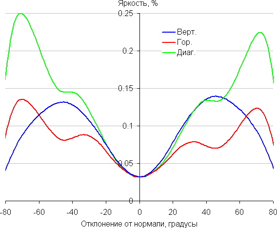 Отметим относительно плавное уменьшение яркости при отклонении от перпендикуляра к экрану во всех трех направлениях, при этом графики яркости полутонов не пересекаются во всем диапазоне измеряемых углов. Яркость черного поля при отклонении от перпендикуляра к экрану возрастает, и при диагональном и вертикальном отклонении возрастает больше, но всего до примерно 0,25% от максимальной яркости белого поля и только при очень большом отклонении (примерно при 72°). Это хороший результат. Контрастность в диапазоне углов ±82° для всех направлений значительно превышает 10:1.