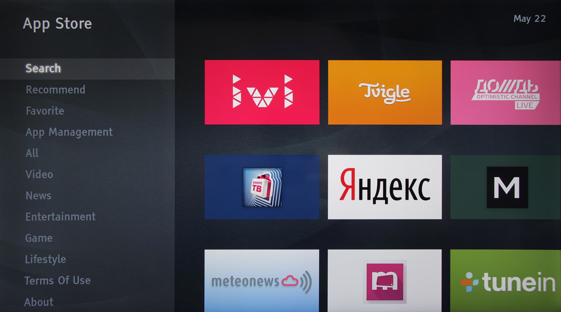 Программной платформой для этого ТВ служит операционная система, основанная на ядре Linux. Заглавная страница интерфейса представляет собой несколько страниц с квадратными и прямоугольными плитками.