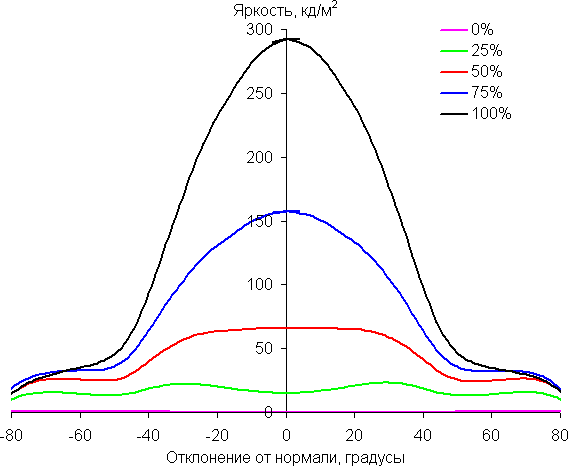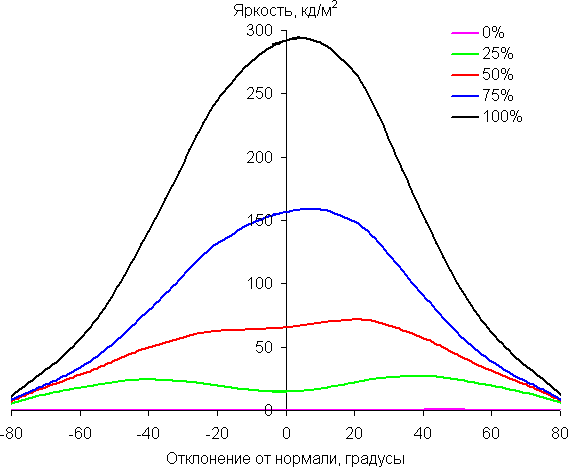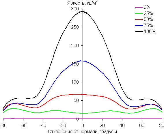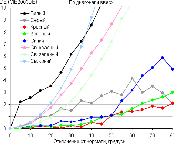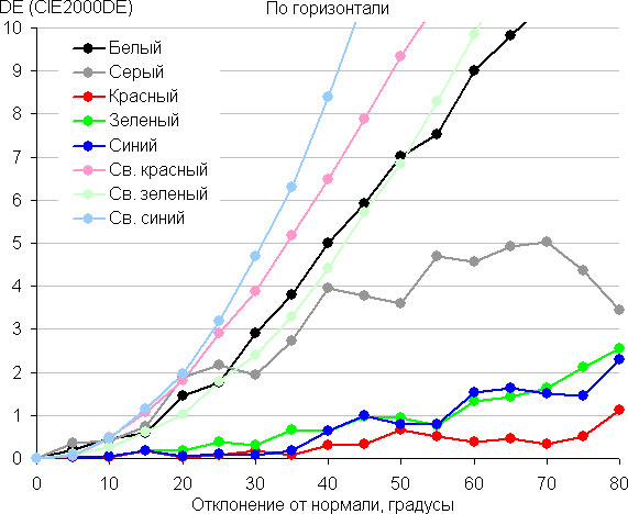 В качестве реперной точки можно выбрать отклонение в 45°. Критерием сохранения правильности цветов можно считать значение ΔE меньше 3. Из графиков следует, что при взгляде под углом первичные цвета меняется несильно, но полутона существенно изменяются, что ожидаемо для матрицы типа VA* и является ее основным недостатком.