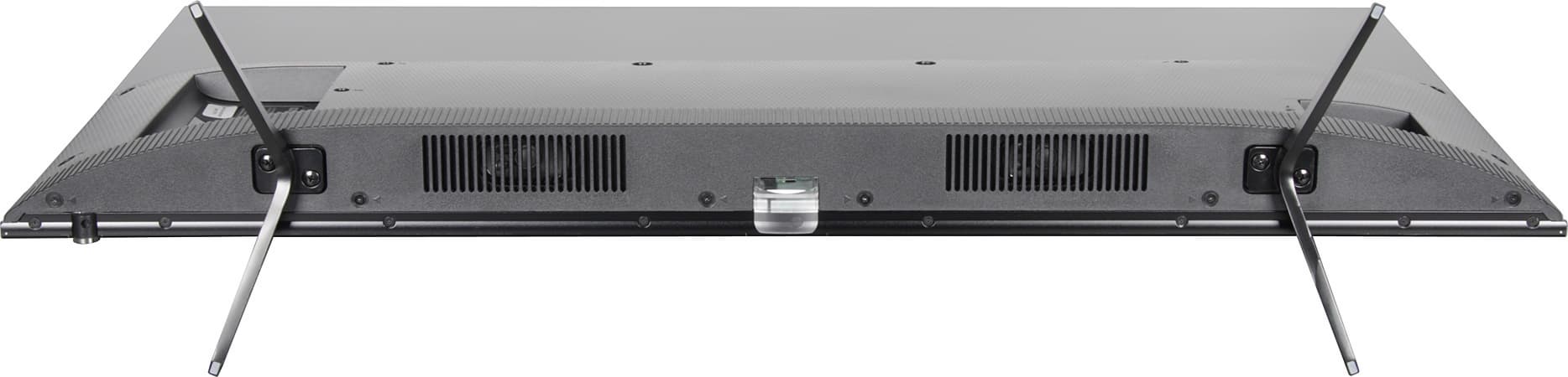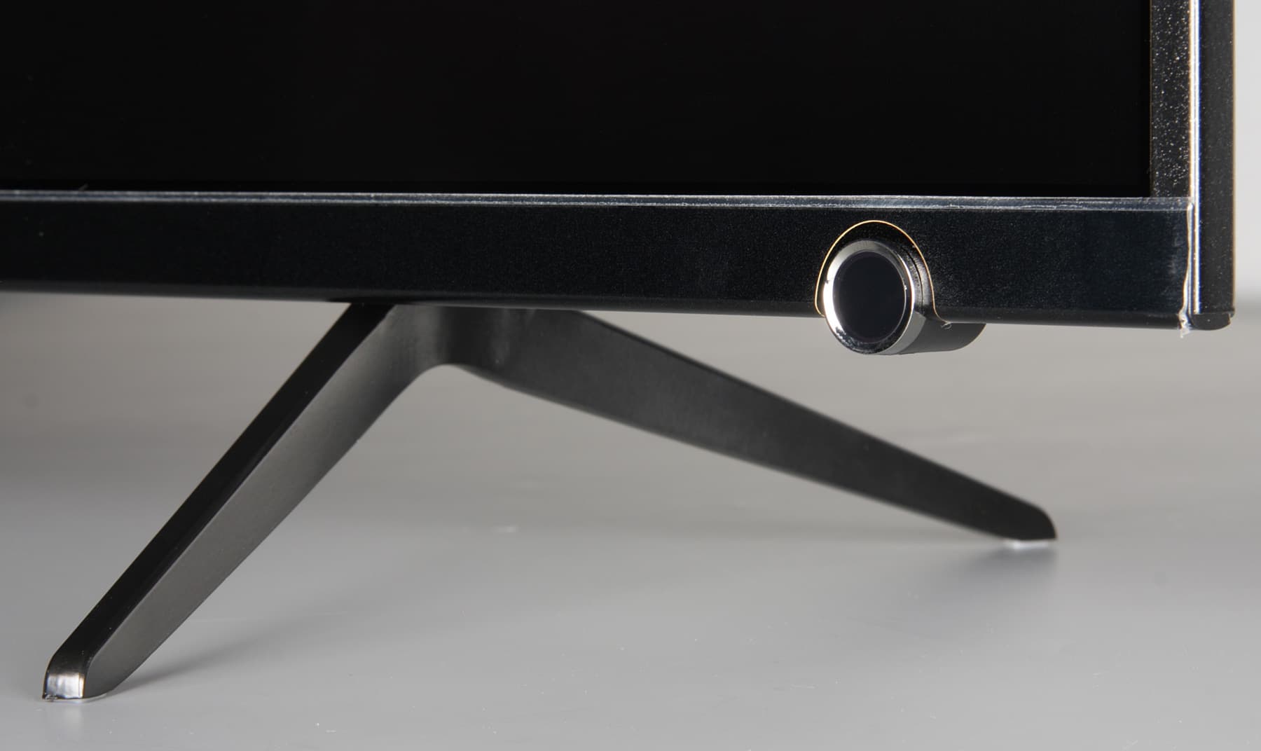 Штатная подставка состоит из двух ножек галочкой, отлитых из алюминиевого сплава. Снаружи ножки анодированы и имеют черное матовой покрытие. Опираются ножки на противоскользящие накладки из полупрозрачного упругого пластика. Жесткость конструкции высокая, телевизор стоит устойчиво с едва заметным наклоном назад.