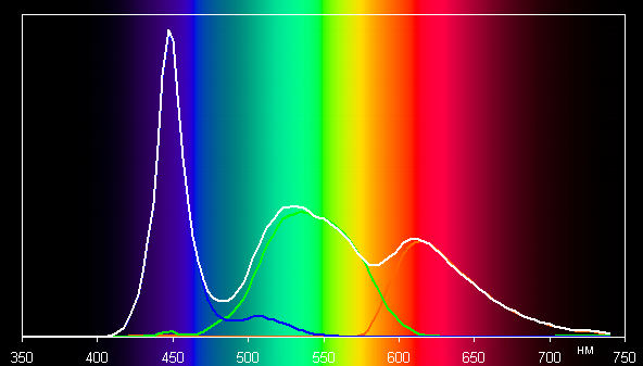 Такой спектр с относительно узким пиком синего и с широкими горбами зеленого и красного цветов характерен для мониторов, в которых используется белая светодиодная подсветка с синим излучателем и желтым люминофором. В данном случае горб зеленого относительно хорошо отделен от горба красного, что и привело к некоторому увеличению цветового охвата.