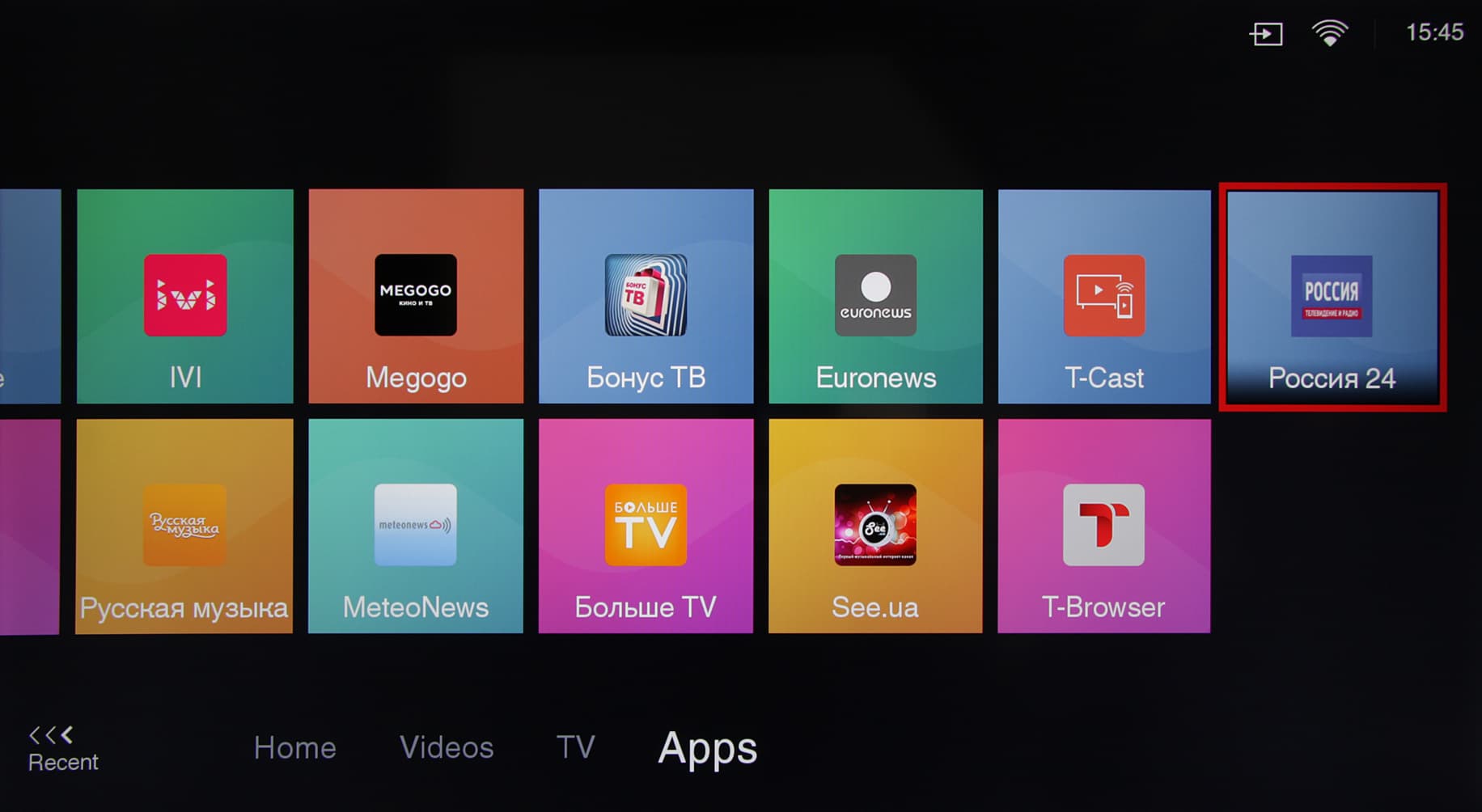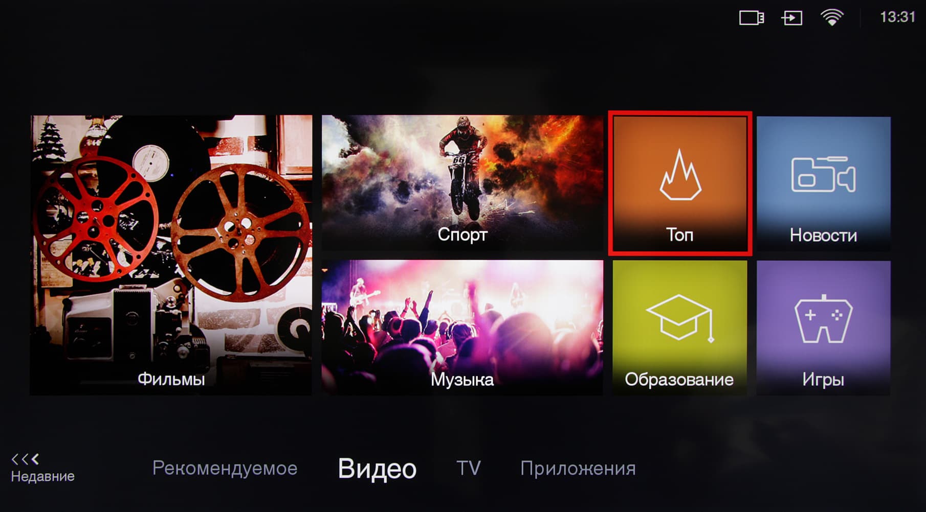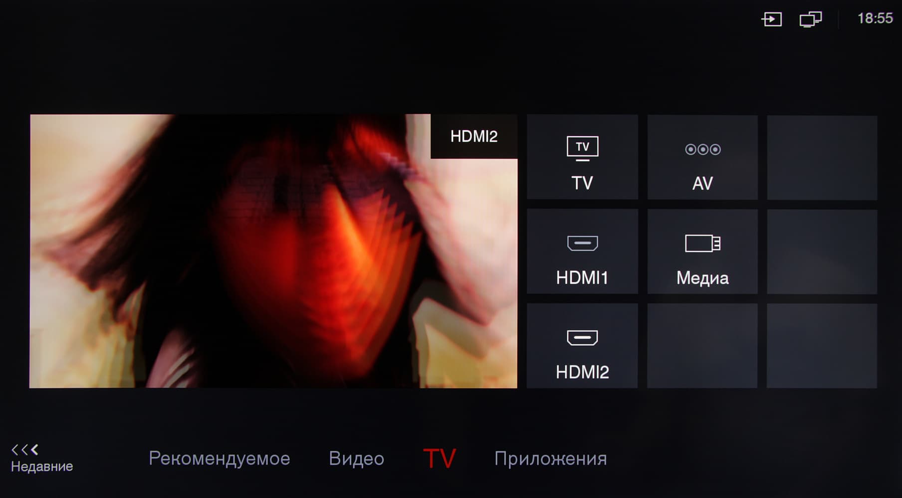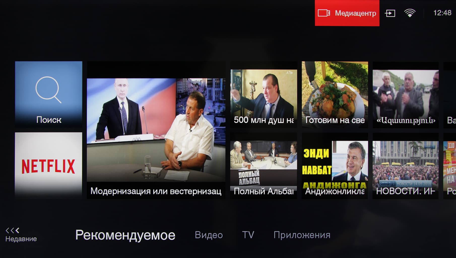 На странице Рекомендуемое есть плитка запуска Netflix и поиска видео (но на странице поиска невозможно ввести текст). На странице TV — выбор источника, в том числе медиацентра. Примечательно, что на этой странице в окне слева выводится видео от текущего источника.