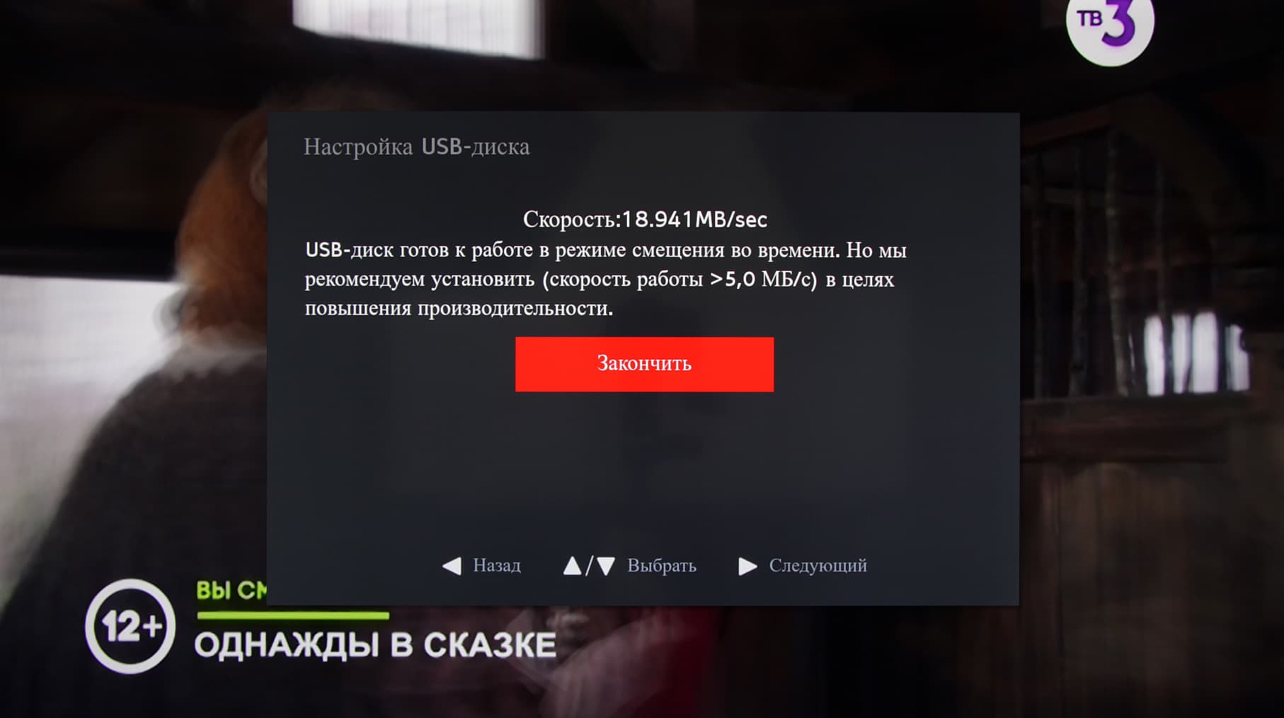 Примечательно, что для функций записи можно использовать USB-носитель с поддерживаемой файловой системой без необходимости его специальной подготовки или форматирования. Только один раз перед первым использованием Time shift необходимо выполнить тестирование скорости накопителя и выбрать размер буфера (до 4 ГБайт).
