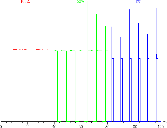 Частота модуляции относительно невысокая, поэтому при быстром движении глаз или в тесте на стробоскопический эффект может быть выявлено мерцание изображения.