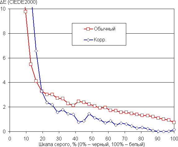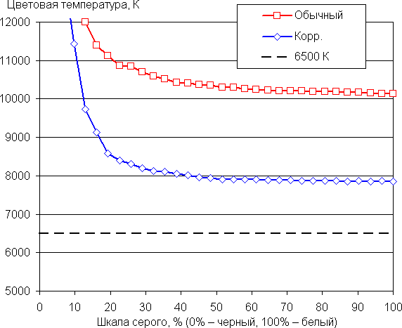 Самый близкий к черному диапазон можно не учитывать, так как в нем цветопередача не так важна, а погрешность измерения цветовых характеристик высокая. Без коррекции цветовая температура великовата, но несложная настройка позволила достигнуть хорошего результата — цветовая температура стала существенно ближе к стандартным 6500 К, а ΔE немного уменьшилась, при этом оба параметра мало изменяются от оттенка к оттенку на значимой части шкалы серого. Для дальнейшего снижения цветовой температуры не хватило диапазона регулировки.