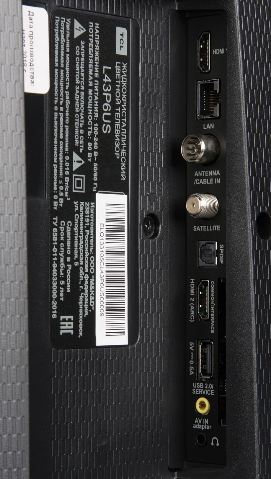 Большинство разъемов стандартные, полноразмерные и размещены более-менее свободно. Исключение — разъем для ввода композитного видеосигнала и стереозвука в аналоговом виде, который представляет собой гнездо для четырехконтактного мини-джека. Впрочем, производитель не забыл приложить к телевизору соответствующий переходник на три RCA.