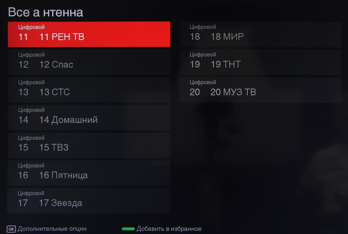 Данная модель, помимо спутникового тюнера, оснащена тюнером, принимающим аналоговый и цифровой сигнал эфирного и кабельного вещания. Качество приема цифровых каналов на комнатную антенну в нашем помещении и в случае данного ТВ было на высоком уровне. Удалось обнаружить только 10 каналов во втором мультиплексе, но в Москве, в том месте, где находится наша тестовая лаборатория, первый мультиплекс периодически пропадает сам по себе, поэтому это не показатель плохого тюнера в ТВ.