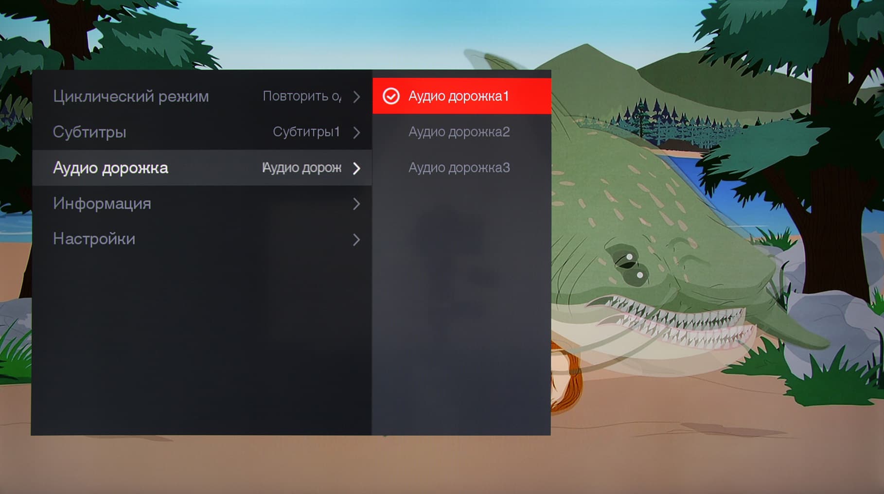 Отдельной кнопкой пульта вызывается контекстное меню, где можно изменить режим воспроизведения, выбрать аудиодорожку и т. д., и перейти в основное меню настроек.