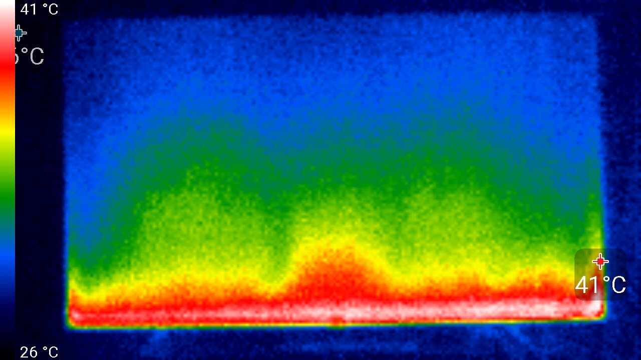 Видно, что основным источником тепла является светодиодная линейка по нижнему краю экрана. Максимальный нагрев локальных участков спереди (нижний правый угол) составил 49 °C.