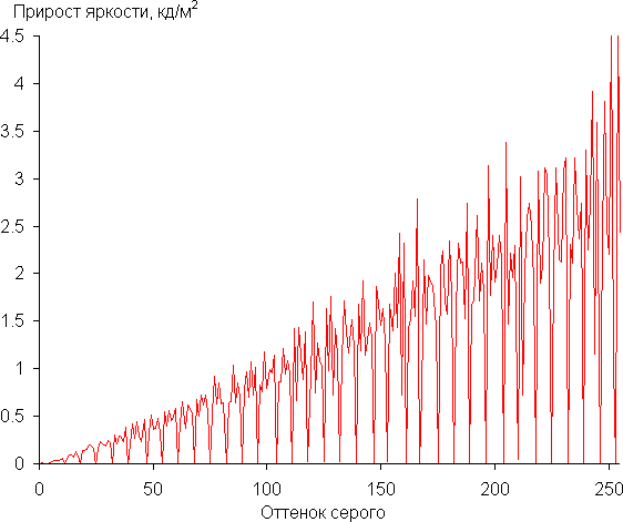 Предварительные тесты показали, что гамма-кривая ближе всего к стандартной при настройке Гамма равной 1. Поэтому далее для оценки характера роста яркости мы измерили яркость 256 оттенков серого (от 0, 0, 0 до 255, 255, 255) именно при этом значении. График ниже показывает прирост (не абсолютное значение!) яркости между соседними полутонами: