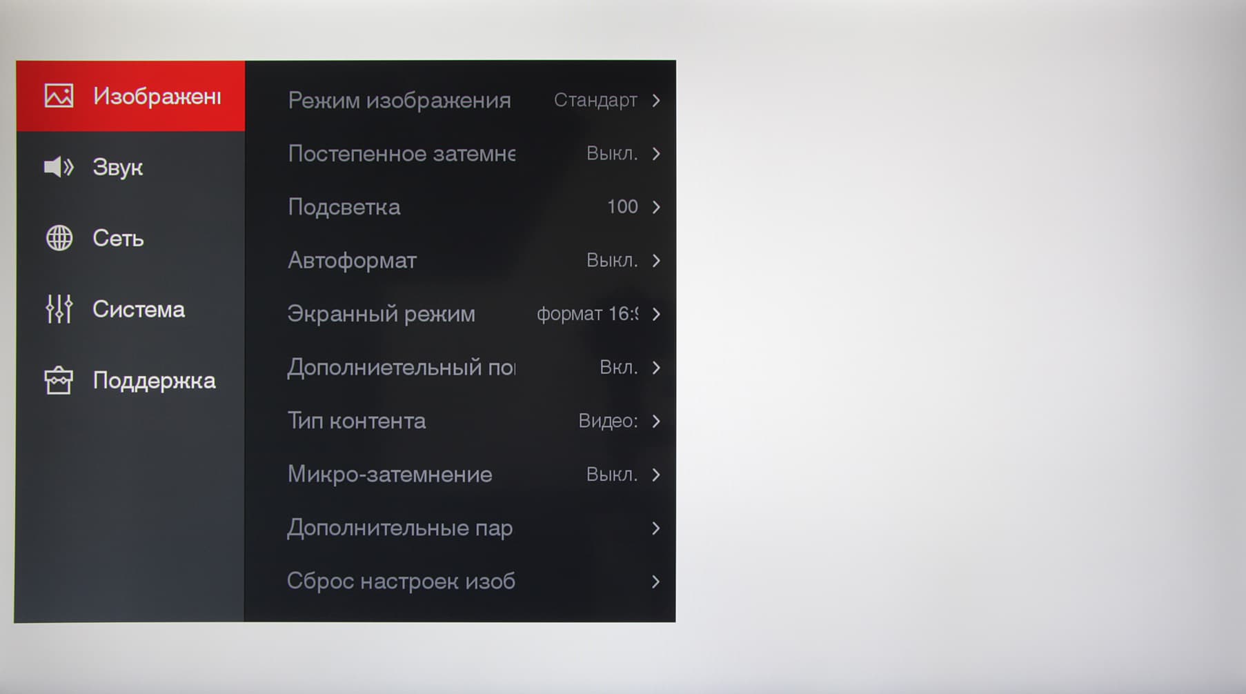 Но по факту из-за высокой контрастности на это обращаешь внимание только при выводе черного поля во весь экран в полной темноте и после адаптации глаз, на реальных изображениях и в домашней обстановке неравномерность засветки черного увидеть практически невозможно. К тому же почти всегда работает динамическая подстройка яркости подсветки — на темных в среднем изображениях яркость понижается, — это еще больше снижает заметность неравномерной засветки черного поля. Эта функция отключена только в режиме 4К при 60 кадр/с.