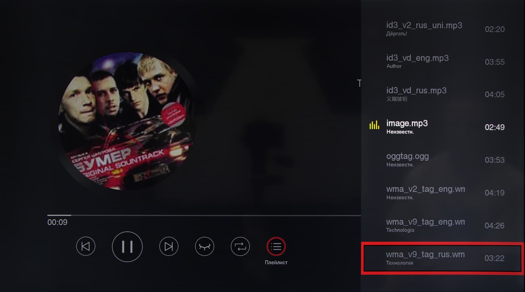 В случае аудиофайлов поддерживаются множество распространенных и не очень форматов, как минимум WAV, AAC, AC3, MP3, M4F, OGG, FLA. Файлы WMA не воспроизводятся. В MP3 поддерживаются тэги (русские должны быть в Unicode) и встроенные картинки-обложки.